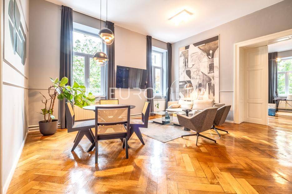 Na prodaju je prostran građanski stan površine 172 m² smješten u visokom prizemlju reprezentativne i odlično održavane zgrade s obnovljenom fasadom i krovom.Stan je adaptiran prije nekoliko godina te je odmah useljiv i ne zahtijeva dodatna ulaganja.Prostor se sastoji od velikog ulaznog hodnika, četiri impozantna salona s visokim stropovima od 370 cm, kuhinje, manje sobe i kupaonice. Stan ima centralno grijanje, novu vanjsku stolariju, a u svakoj sobi sačuvane su i kalijeve peći na drva koje prostoru daju poseban šarm i autentičnost. Orijentacija zapad - sjever osigurava ugodnu svjetlost i miran boravak.Zgrada se nalazi na iznimno atraktivnoj lokaciji u blizini Marulićevog trga, Mažuranca, Botaničkog vrta i Glavnog kolodvora. Riječ je o jednom od najuglednijih i najpoželjnijih dijelova grada, u neposrednoj blizini parkova, kulturnih institucija i važnih prometnih čvorišta.Zbog svoje veličine, rasporeda i prestižne lokacije, stan je idealan za stanovanje, ali i za različite poslovne namjene poput odvjetničkog ili arhitektonskog ureda, konzultantskih djelatnosti, ordinacije ili galerijskog prostora.Sve dodatne informacije dostupne su na upit.