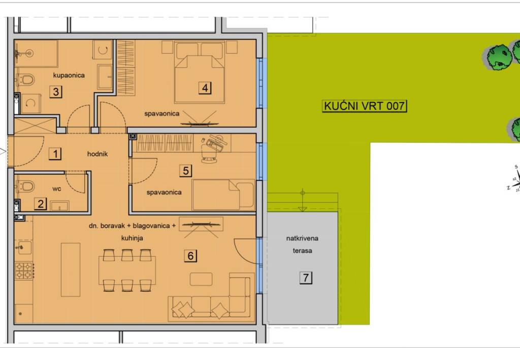 Sloboština, Otok,Green Island Residence, moderno i ekskluzivno stambeno naselje, novogradnja visokog standarda, koja spaja suvremeni dizajn i visoku energetsku učinkovitost.Stan S123 - trosoban u prizemlju, zatvorene površine 68,20 m² s natkrivenom terasom 8,37 m² (4,18) i vrtom 42,25 m² (3,59), ukupno 75,97 m².Stanu pripada garažno parking mjesto D-46 površine 16,66 m² (8,33), te spremište D-46 u podrumu površine 5,10 m² (2,55). Mogućnost kupnje dodatnog parkirnog mjesta i spremišta.Ukupno obračunski 87,48 m².Sastoji se od ulaznog hodnika, otvorenog dnevnog boravka s kuhinjom i blagovaonicom, dvije spavaće sobe, kupaonice, odvojenog toaleta, natkrivene terase i vrta.Oprema:Podno grijanje - ITPS sustav s centralnom pripremom tople vodeUgrađeni klima uređajiPVC stolarija - troslojno IZO staklo, električni podizači roleta i komarniciVisokokvalitetni parketi i keramika 1. klase renomiranih proizvođačaPremium sanitarije i armatureVideo portafonSolarni paneli na krovu za veću energetsku učinkovitostSigurnosna protuprovalna vrataLED rasvjeta u stubištima i zajedničkim prostorimaBalkonske ograde modernog dizajnaEnergetski certifikat A+Projekt Green Island Residence nudi moderan način stanovanja u zatvorenom tipu naselja koje se sastoji od 2 stambene zgrade po 79 stanova, dječjeg igrališta, 160 garažnih parkirnih mjesta, 50 vanjskih parkirnih mjesta i 160 spremišta.Nalazi se na odlično povezanoj lokaciji u blizini vrtića, škola, doma zdravlja, trgovina i javnog prijevoza. Shopping centar Avenue Mall i park Bundek na nekoliko minuta udaljenosti. Brza povezanost s centrom grada, zračnom lukom i autocestom.Predviđeno useljenje: proljeće 2027Kupci su oslobođeni plaćanja poreza na nekretnineMogućnost kupnje putem zelenog kredita.Sve dodatne informacije na upit.