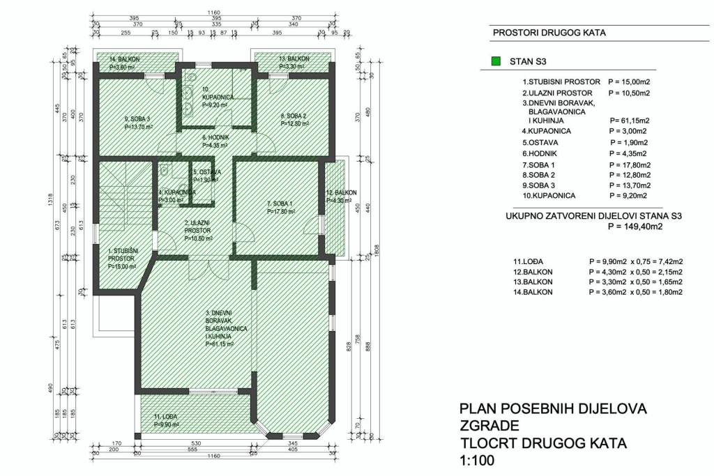 Apartment S-3 – 2nd floor (penthouse) – living area 134.40 m2 (3 bedrooms + 2 bathrooms) + loggia (10 m2 - J) + 3 x balconies (4.3 + 3.6 + 3.3 m2) + attic storage (23.35 m2) + garage parking space GPM1 (16 m2) + outdoor parking space PM3 (14.50 m2), net calculated area 163.69 m2 = 595,000 EUR