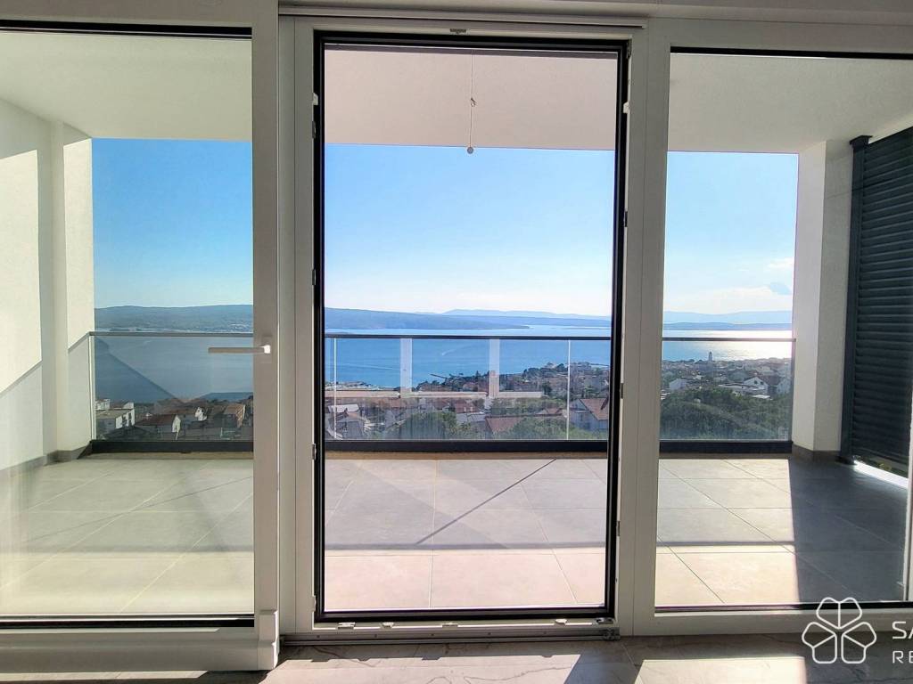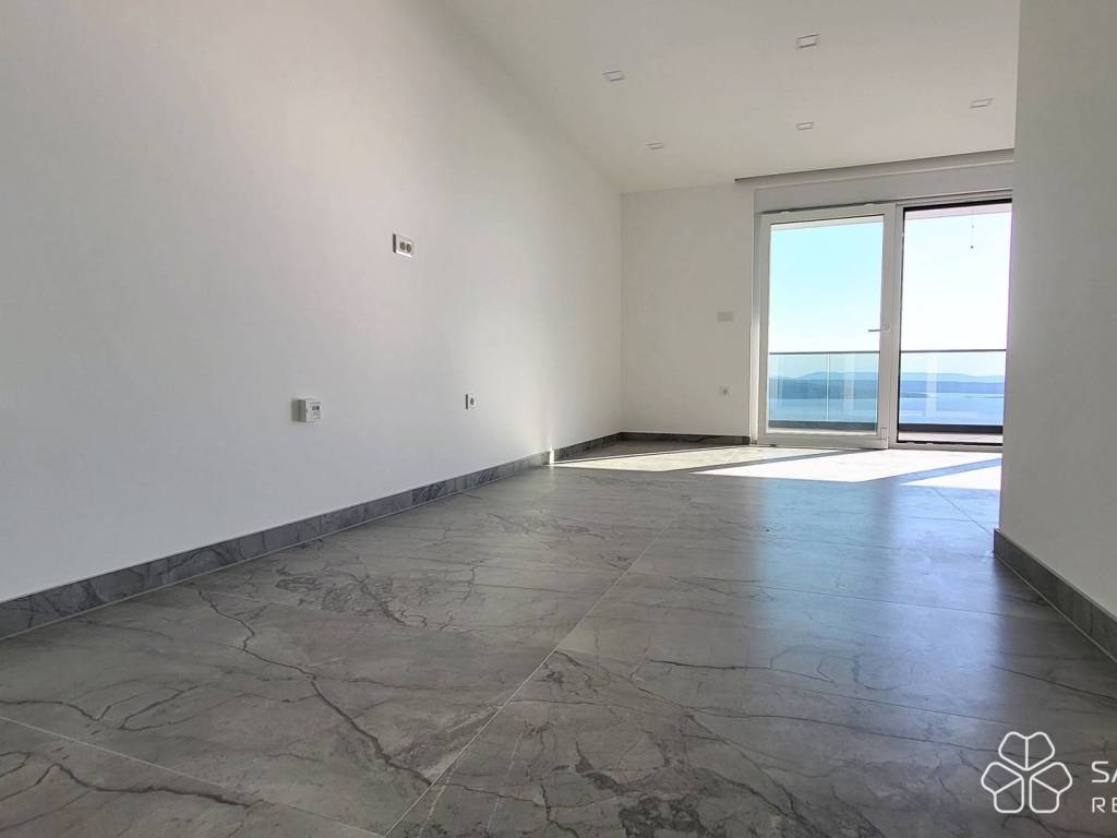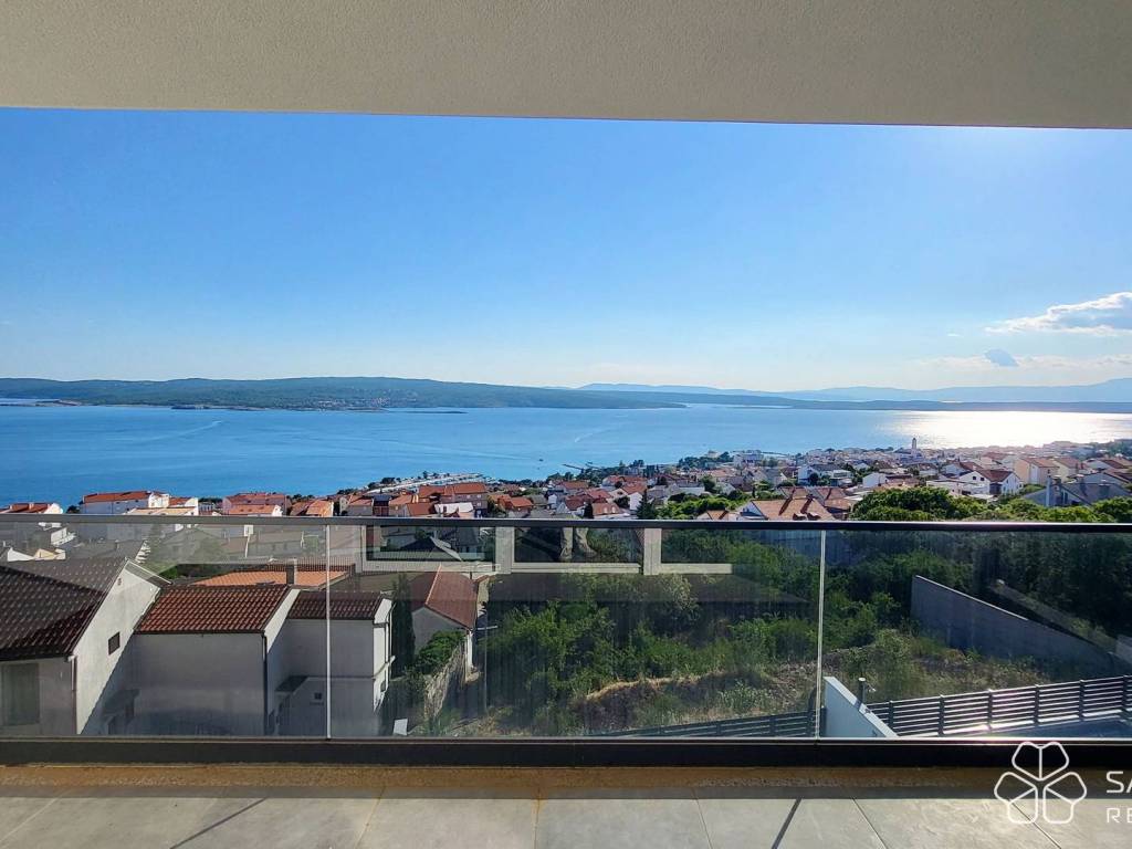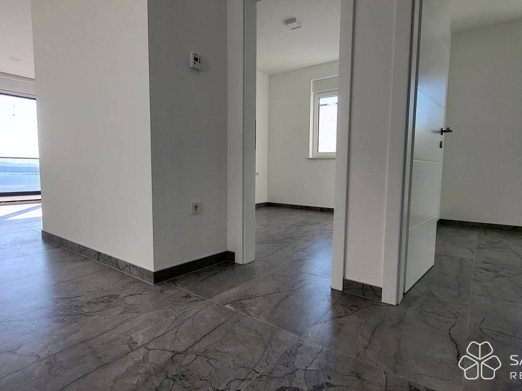 The apartment consists of two bedrooms, a bathroom, a kitchen with a dining room connected to a spacious living room and access to a covered terrace. The terrace offers a panoramic view of the sea, the city and the island of Krk - a view that will remain unobstructed. High-quality materials were used: electric underfloor heating in all rooms, security doors, top-quality ceramics, LED lighting, PVC joinery with mosquito nets and aluminum electric shutters, and air conditioning. The apartment comes with one parking space.