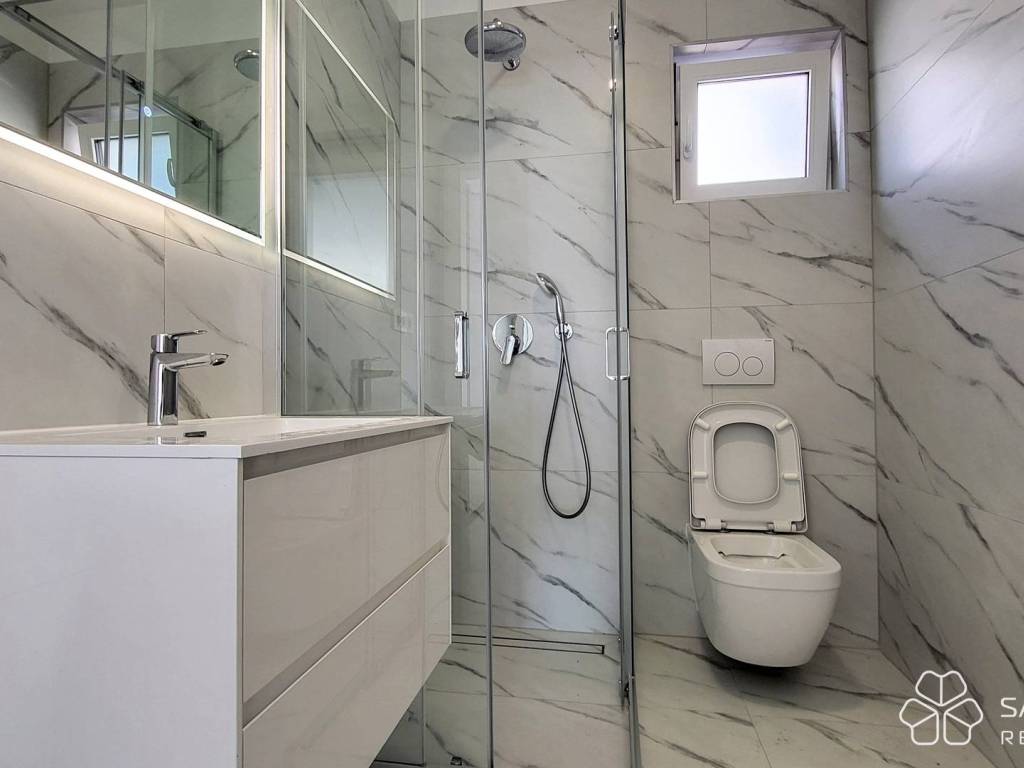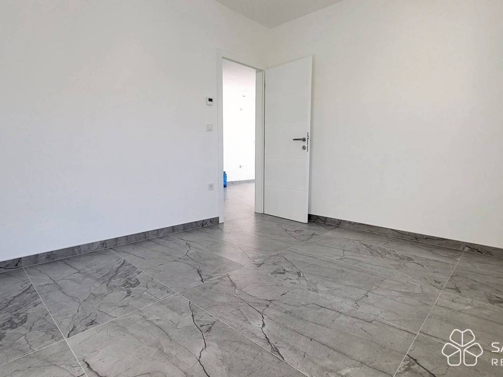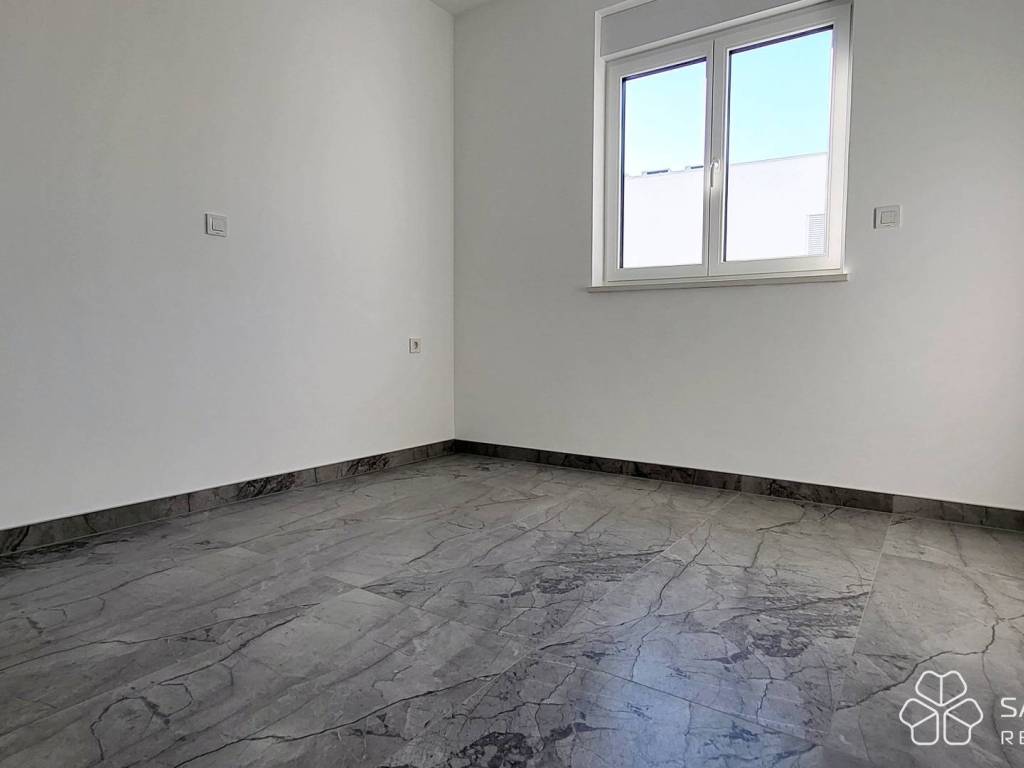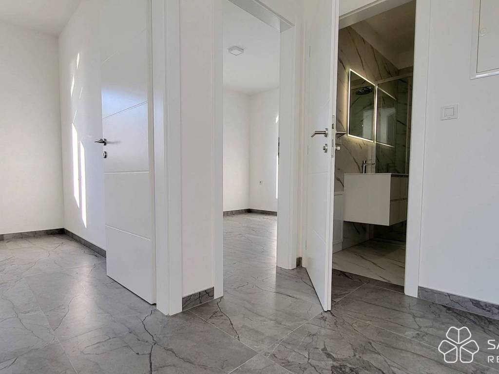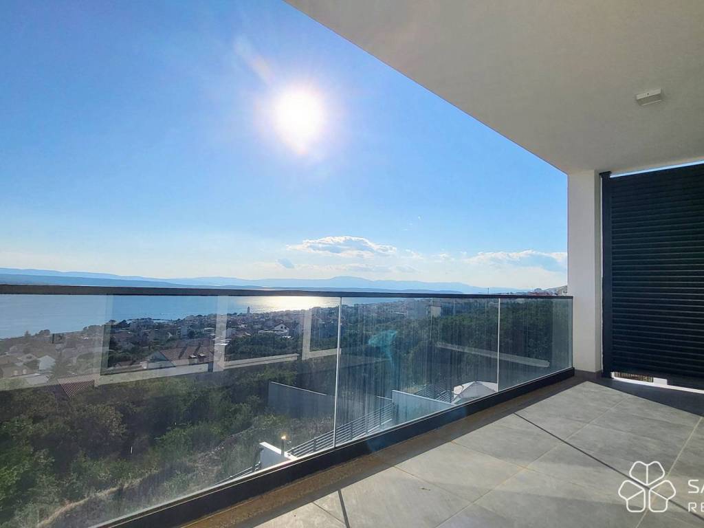 The apartment consists of two bedrooms, a bathroom, a kitchen with a dining room connected to a spacious living room and access to a covered terrace. The terrace offers a panoramic view of the sea, the city and the island of Krk - a view that will remain unobstructed. High-quality materials were used: electric underfloor heating in all rooms, security doors, top-quality ceramics, LED lighting, PVC joinery with mosquito nets and aluminum electric shutters, and air conditioning. The apartment comes with one parking space.
