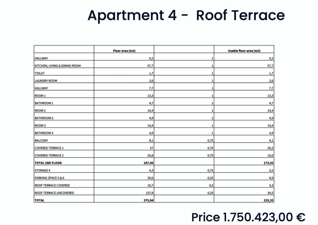 Apartment S-4B – 2nd floor + rooftop terrace – living area 131.43 m2 (3 bedrooms + 3 bathrooms + WC) + balcony (8 m2) + covered terraces (47 m2) + storage (4 m2) + rooftop terrace with swimming pool (147 m2) + two outdoor parking spaces no. 5 and 6; net calculated area 225.35 m2 = 1,750,423.00 EUR