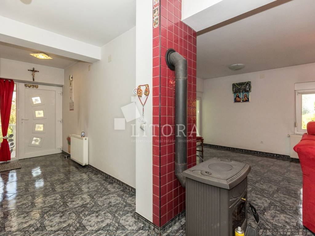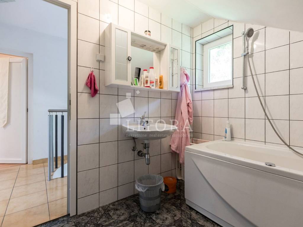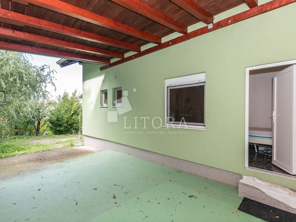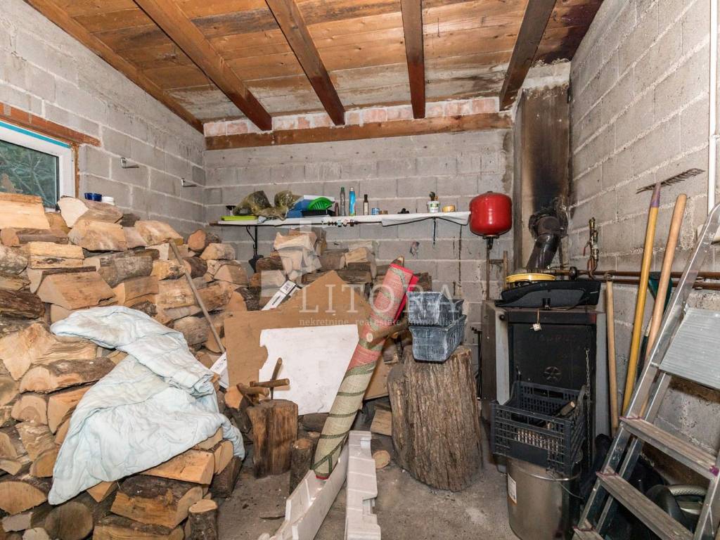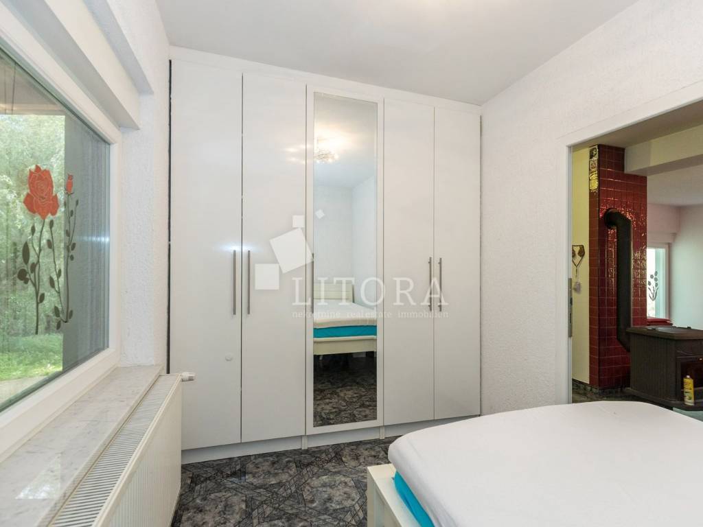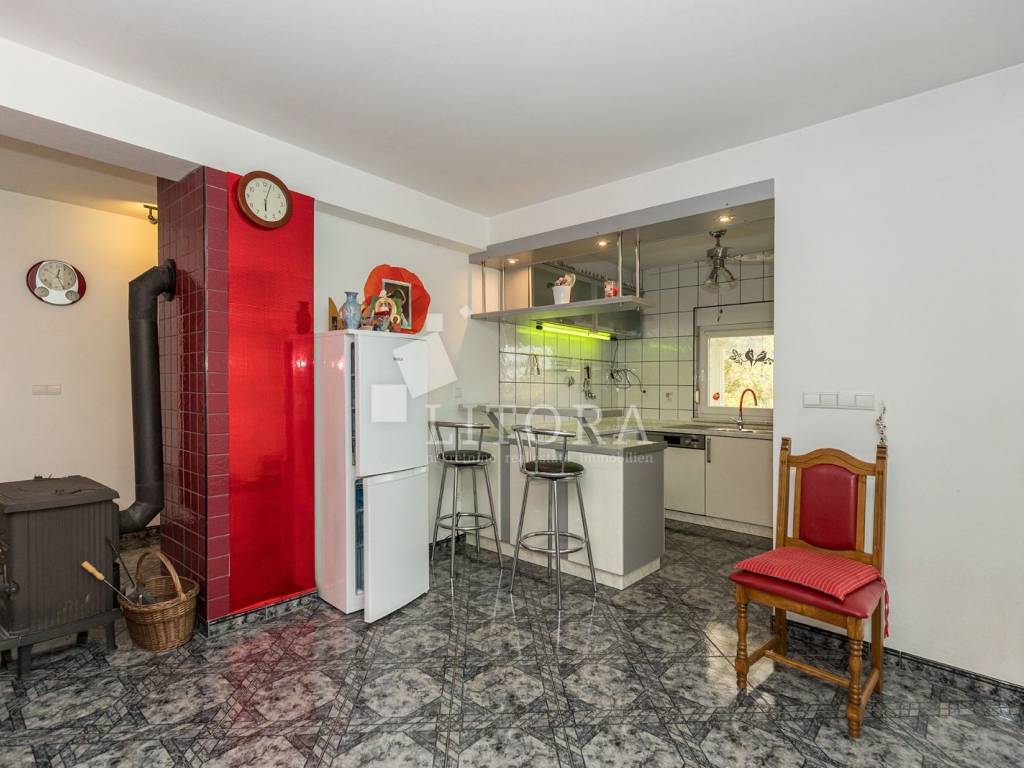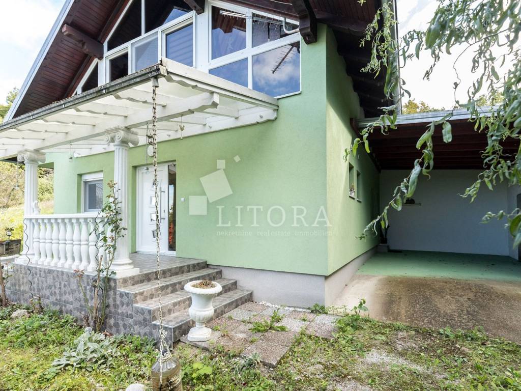 Samobor – Gregurićev Breg The property is located in a quiet and hilly area of Samobor, only 5 km from the city center. This is a detached family house with two levels: ground floor and attic. The total usable living area is 112.64 m². The ground floor consists of a spacious entrance hall, bathroom, guest toilet, a large living room with kitchen, and one bedroom. An internal spiral staircase leads to the attic, which includes a hallway, bathroom, toilet, and two bedrooms, both with access to a glazed loggia measuring 16.33 m². The house is built on a 720 m² plot. Within the property, there is a parking canopy / covered parking space as well as a small storage room / boiler room. The house is equipped with central heating on wood. The property is move-in ready, fully furnished, and the furniture is included in the purchase price. The house currently does not have a usage permit; the application has been submitted and is in process.
