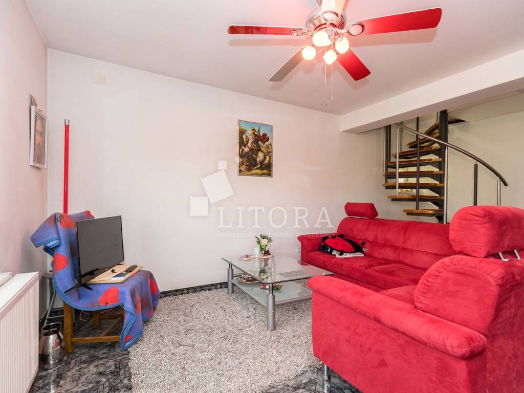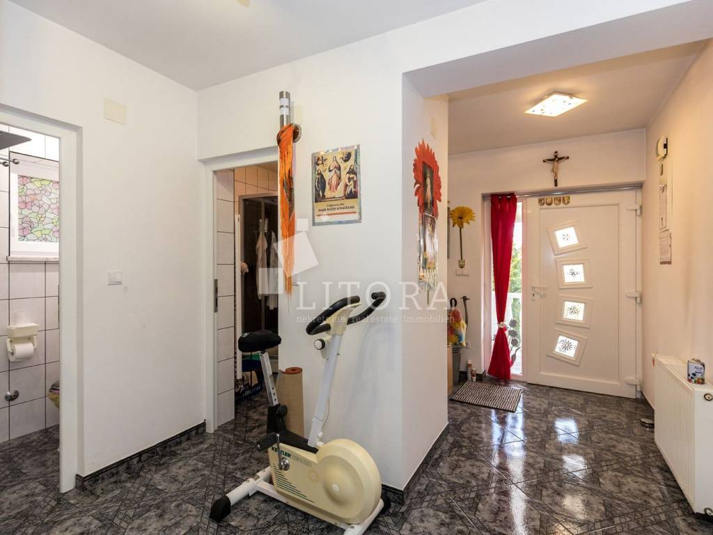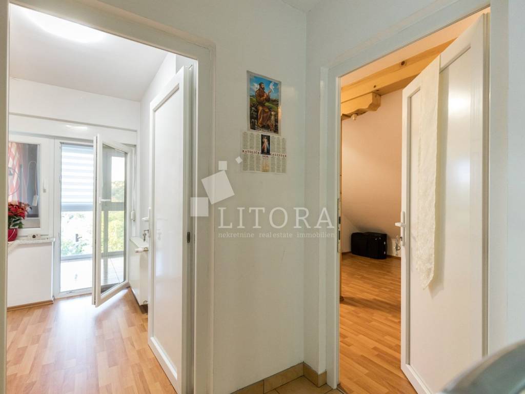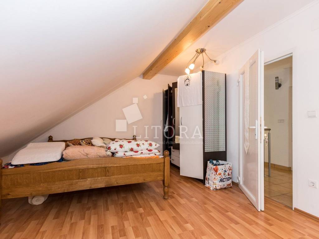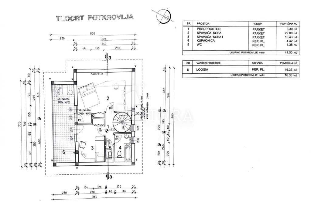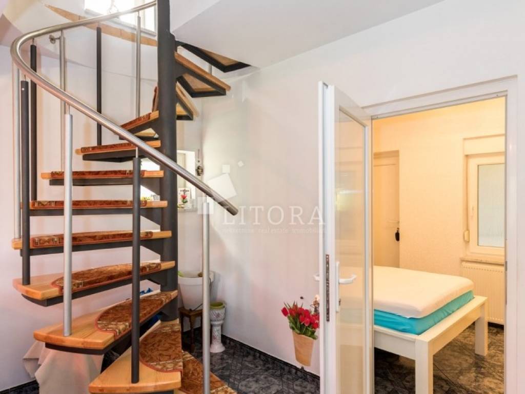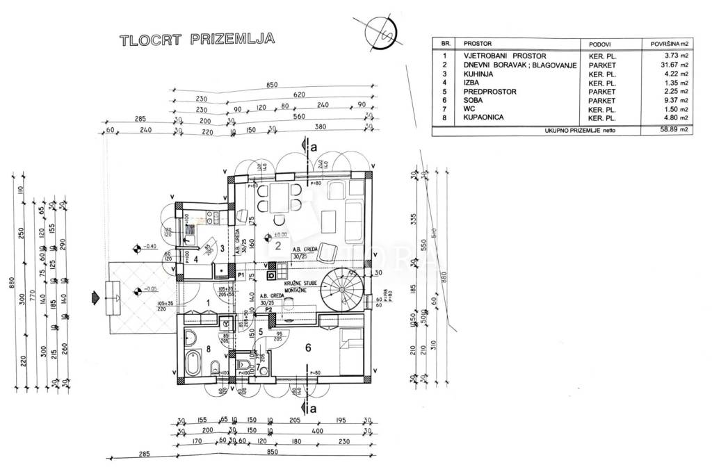 Samobor – Gregurićev Breg The property is located in a quiet and hilly area of Samobor, only 5 km from the city center. This is a detached family house with two levels: ground floor and attic. The total usable living area is 112.64 m². The ground floor consists of a spacious entrance hall, bathroom, guest toilet, a large living room with kitchen, and one bedroom. An internal spiral staircase leads to the attic, which includes a hallway, bathroom, toilet, and two bedrooms, both with access to a glazed loggia measuring 16.33 m². The house is built on a 720 m² plot. Within the property, there is a parking canopy / covered parking space as well as a small storage room / boiler room. The house is equipped with central heating on wood. The property is move-in ready, fully furnished, and the furniture is included in the purchase price. The house currently does not have a usage permit; the application has been submitted and is in process.