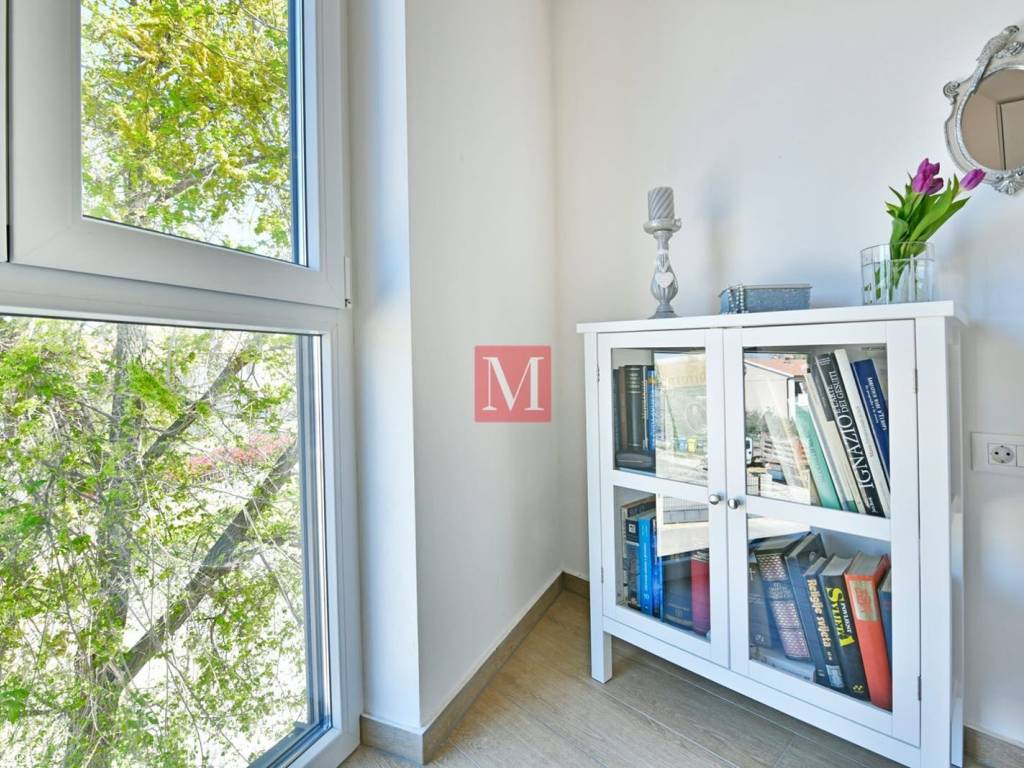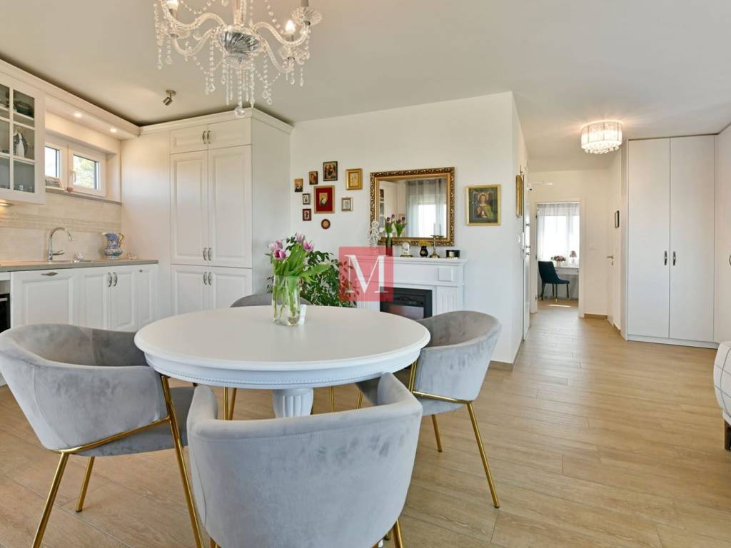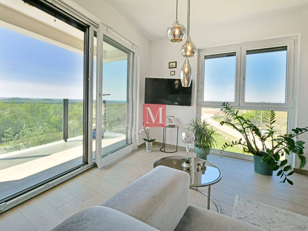 Elegant and bright 3 bedroom apartment with sea views on the 2nd floor of a newer building, in the quiet village of Žbandaj, just a few minutes' drive from Poreč and the sea. The apartment with a total area of 97.57m2 delights with its sophisticated decoration and abundance of natural light that spreads throughout the entire space through large glass walls. It consists of an entrance hall, a pleasant open-space living room with dining room and a modernly equipped kitchen in a classic style, three spacious bedrooms, two bathrooms, an additional toilet and a practical storage room, and a special atmosphere is provided by a covered terrace overlooking the greenery. The apartment exudes harmony and warmth thanks to carefully selected furniture, details with character and unobtrusive luxury. It is equipped with quality equipment, air conditioning, modern lighting and top-quality ceramics in the bathrooms. The apartment also comes with a parking space and a storage room in the basement of the building. More info on personal request. Agency fee: 2% + VAT.