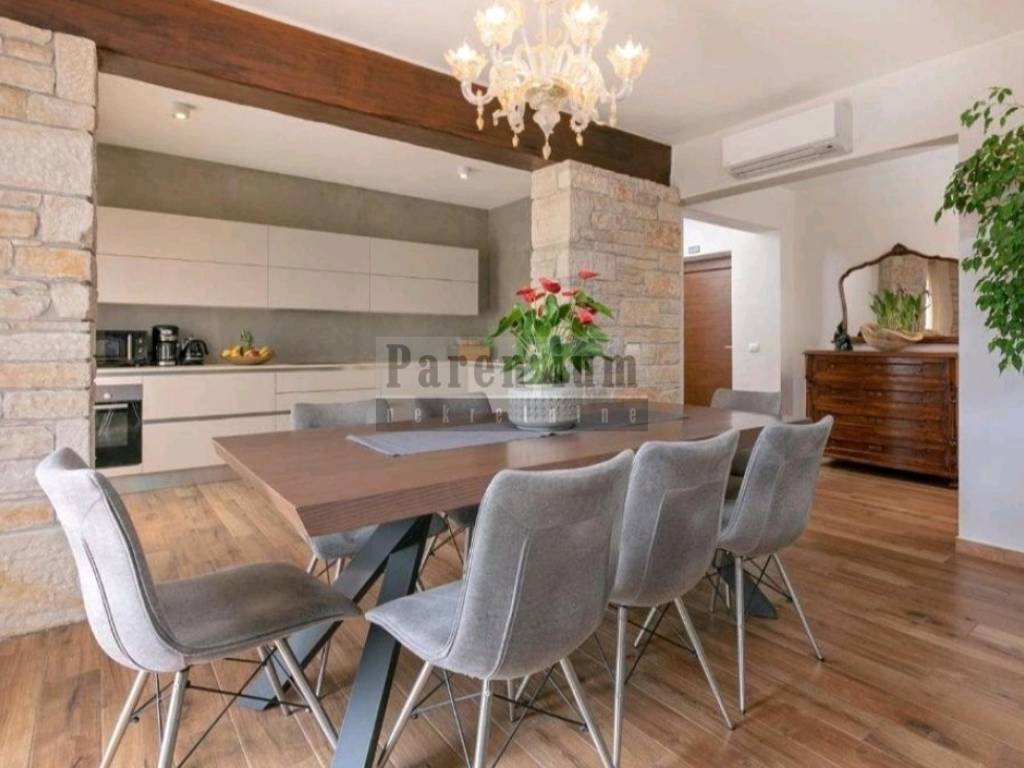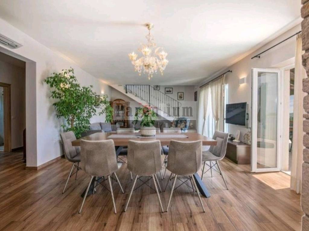 Porec, surroundings, 12km away from the sea, this exclusive villa with a swimming pool of 355m2 is for sale. It is located in a place with all the necessary facilities. On the ground floor of the villa there is a spacious living room with access to the terrace and sun deck. Kitchen, dining room, one bedroom with bathroom. Upstairs are 3 more bedrooms, each with its own bathroom. Two bedrooms have access to the terrace with a beautiful open view. In the basement of the house there is a play room and fitness. Each bedroom has its own air conditioning, while the ground floor and underfloor heating. The yard is maintained, 560m2.