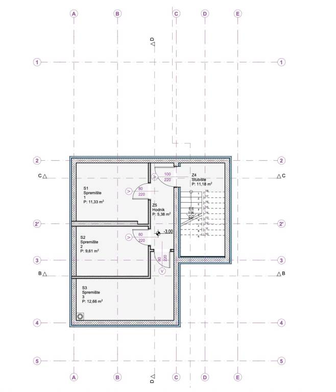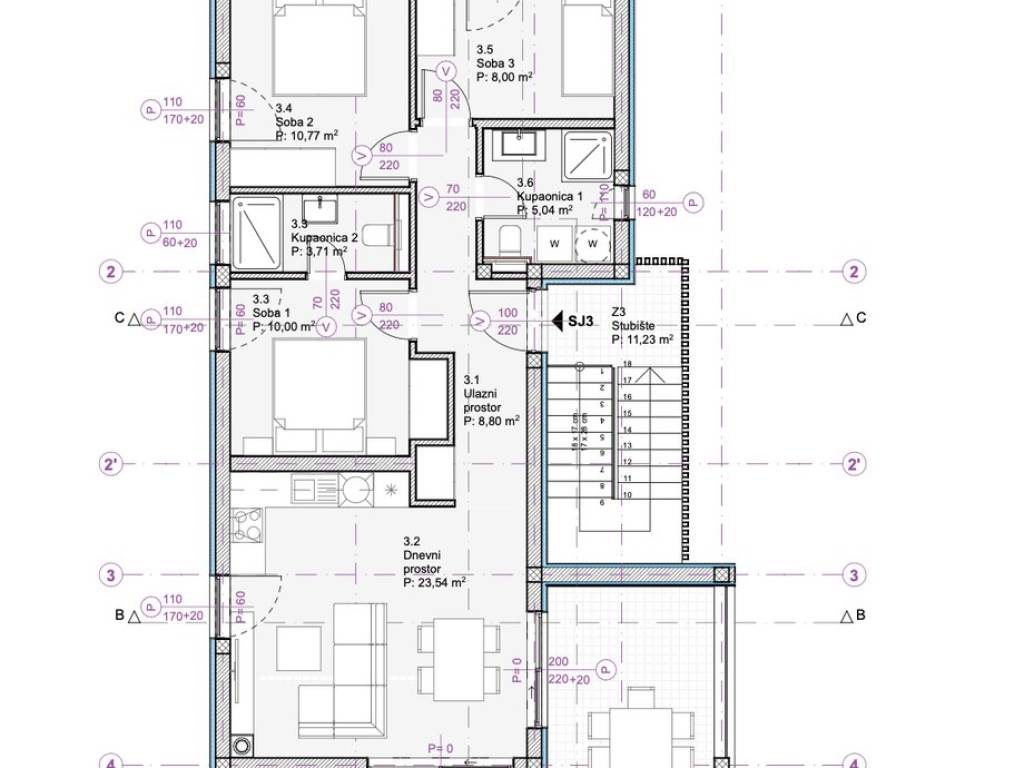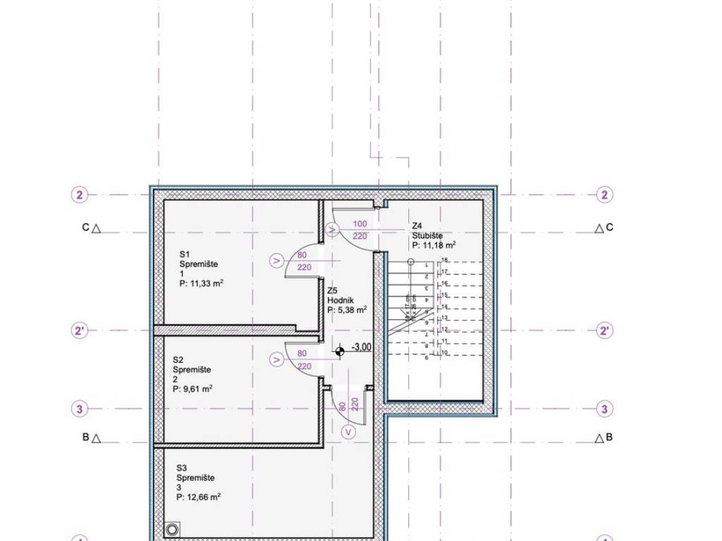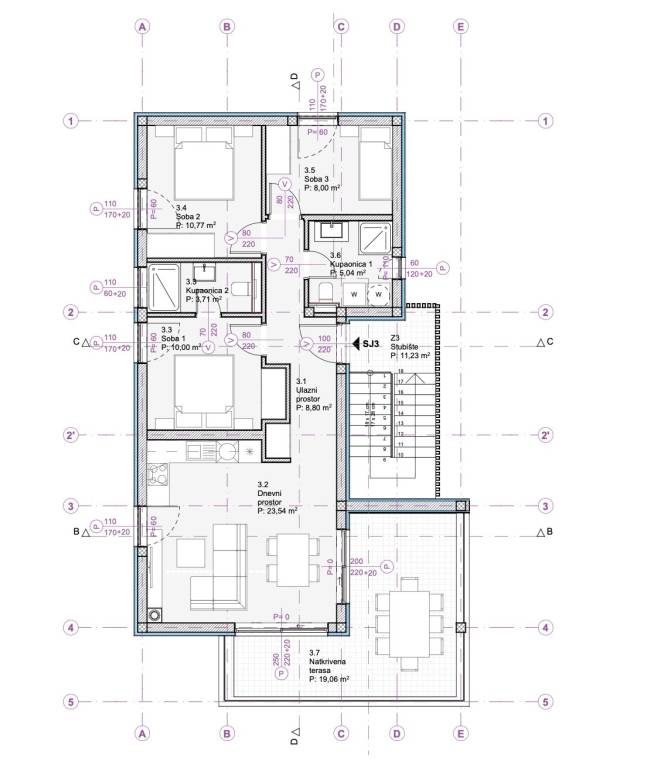 Apartment S3 is a penthouse - located on the 2nd (also the top) floor of the building. It covers 89.42 m2 of calculated / saleable area. Of that, 69.86 m2 is the internal living area of the apartment + 19.06 m2 of the floor area of the covered terrace + storage room no. 3 with a floor area of 12.66 m2, and even 2 outdoor parking spaces P1 and P6, which altogether by coefficient amount to 89.42 m2.