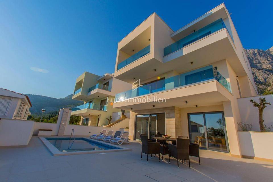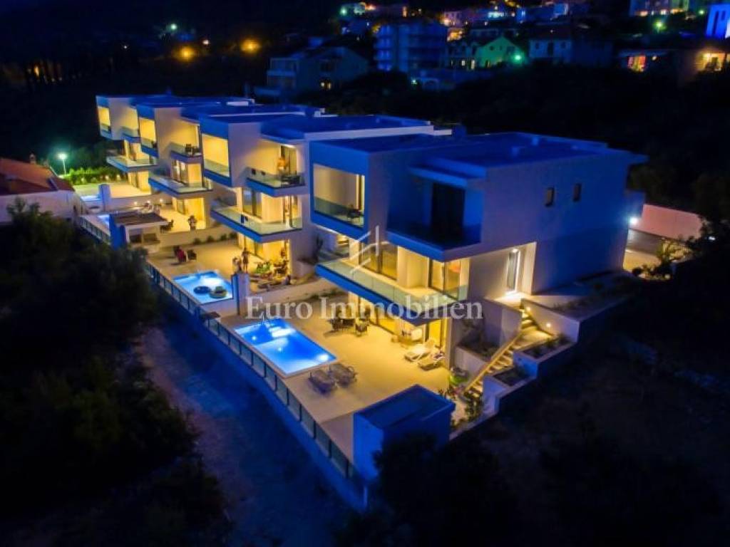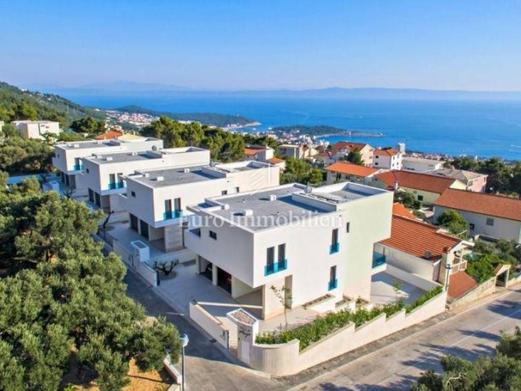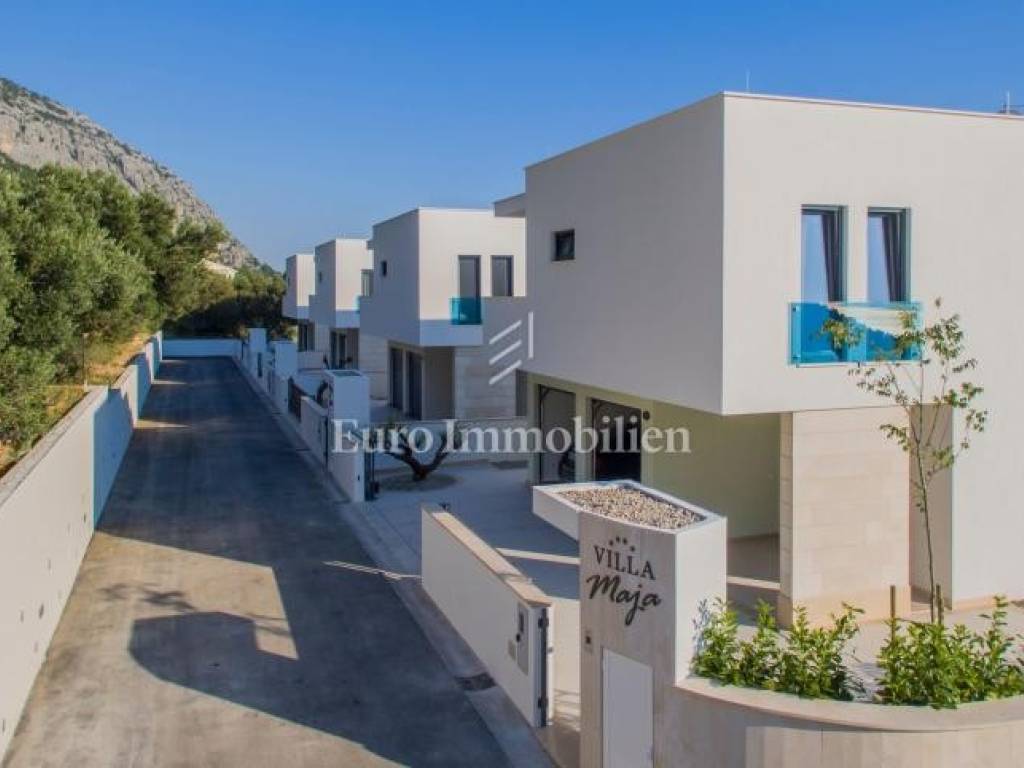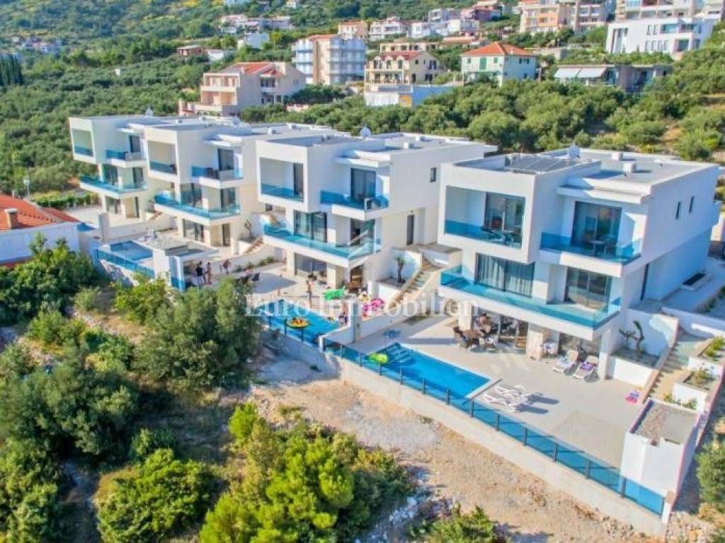 When designing these villas, nothing is left to chance. The architectural style of the villa is characterized by simple lines and minimalist design. High quality materials are carefully selected during construction. The construction technique itself made it possible to meet the high set standards and enabled the energy consumption in each villa to be reduced to a minimum. Luxury and creativity had a high priority in the construction of this new 4-villa complex. The villas allow their tenants to stay in large, well-lit rooms with panoramic views of the Adriatic Sea, islands and on the other side of the mountain Biokovo. Each villa has 4 bedrooms with bathroom and a total of 7 bathrooms in each villa, large living and dining area, terrace on each floor, 2 modern and fully equipped kitchens, along with sauna, fitness room, large terrace with outdoor pool and beautiful views of the city and the sea. Each villa has a garage with 2 parking spaces and 2 outdoor parking spaces. Extremely high quality materials such as Brač stone, Marazzi tiles, security doors, 1st class oak parquet, Toshiba air conditioning, solar panels, stone fireplaces, etc. were used in the construction.