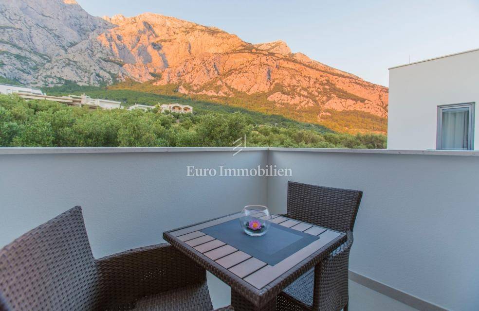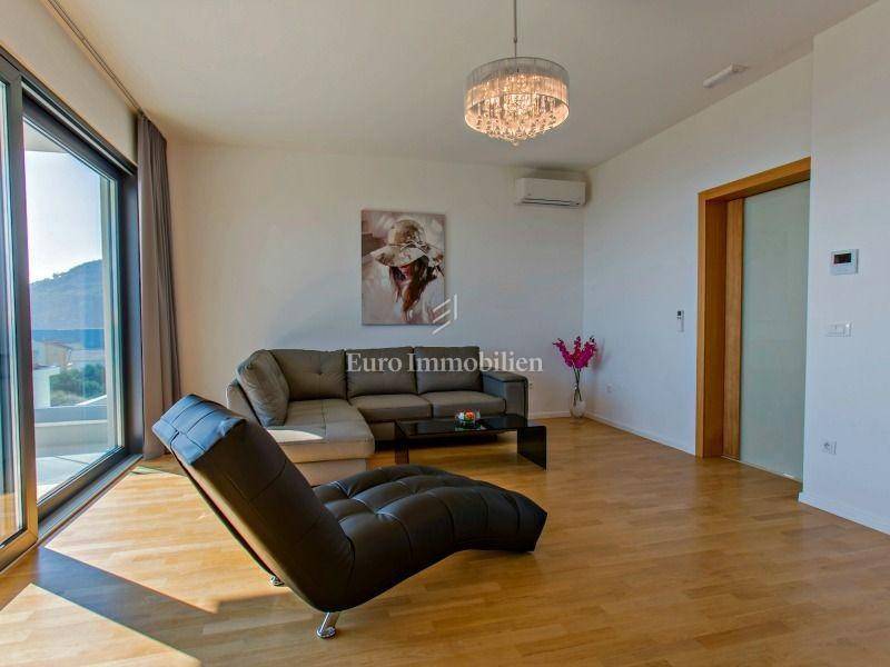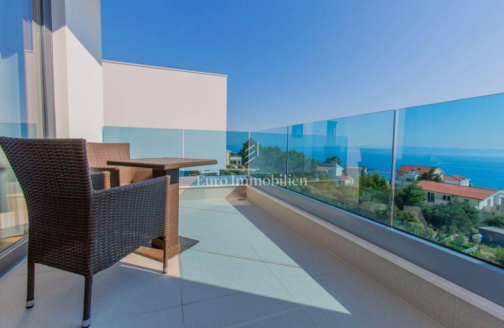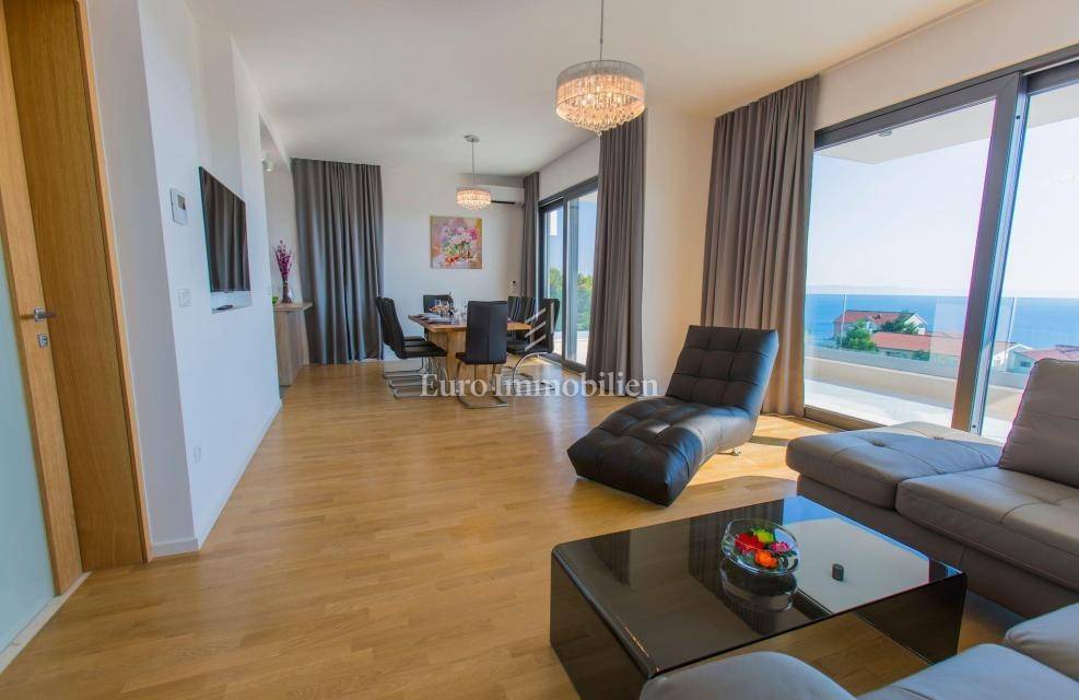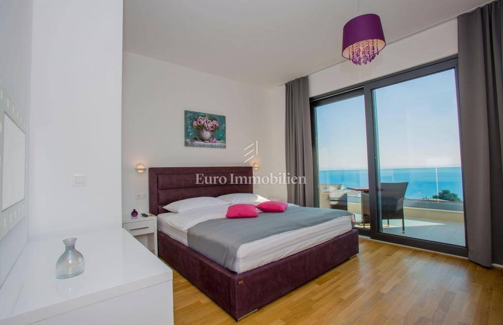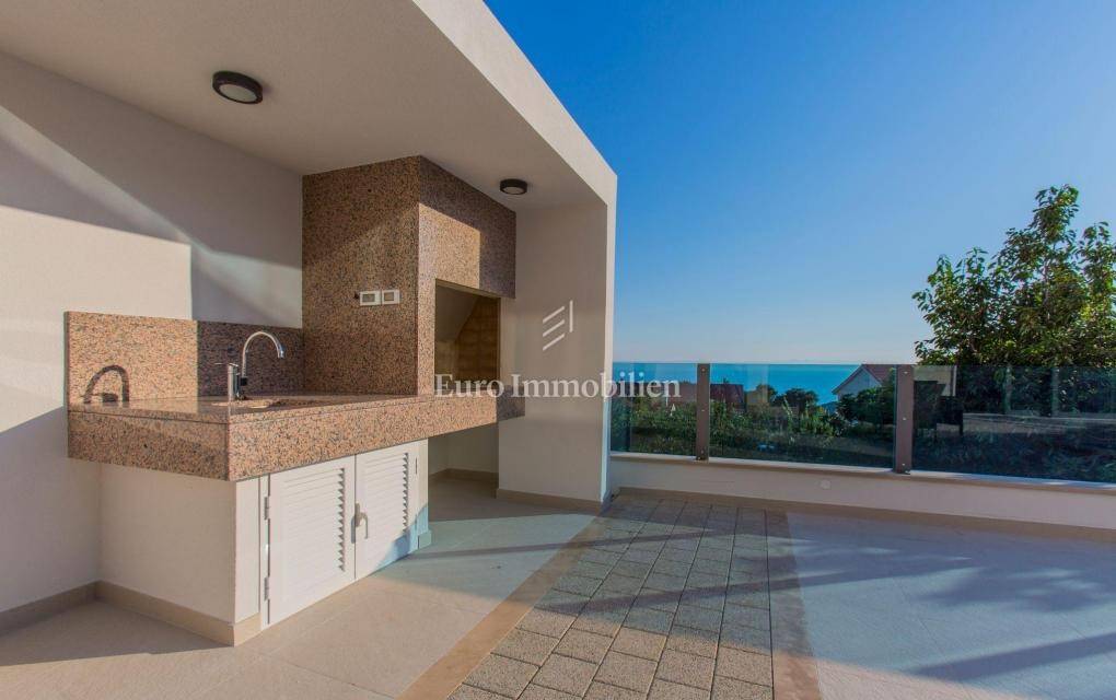 When designing these villas, nothing is left to chance. The architectural style of the villa is characterized by simple lines and minimalist design. High quality materials are carefully selected during construction. The construction technique itself made it possible to meet the high set standards and enabled the energy consumption in each villa to be reduced to a minimum. Luxury and creativity had a high priority in the construction of this new 4-villa complex. The villas allow their tenants to stay in large, well-lit rooms with panoramic views of the Adriatic Sea, islands and on the other side of the mountain Biokovo. Each villa has 4 bedrooms with bathroom and a total of 7 bathrooms in each villa, large living and dining area, terrace on each floor, 2 modern and fully equipped kitchens, along with sauna, fitness room, large terrace with outdoor pool and beautiful views of the city and the sea. Each villa has a garage with 2 parking spaces and 2 outdoor parking spaces. Extremely high quality materials such as Brač stone, Marazzi tiles, security doors, 1st class oak parquet, Toshiba air conditioning, solar panels, stone fireplaces, etc. were used in the construction.