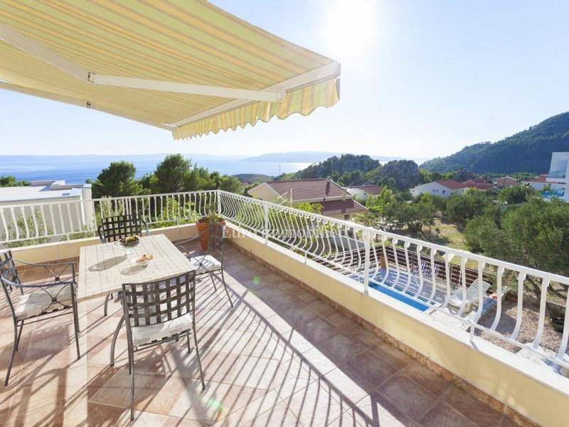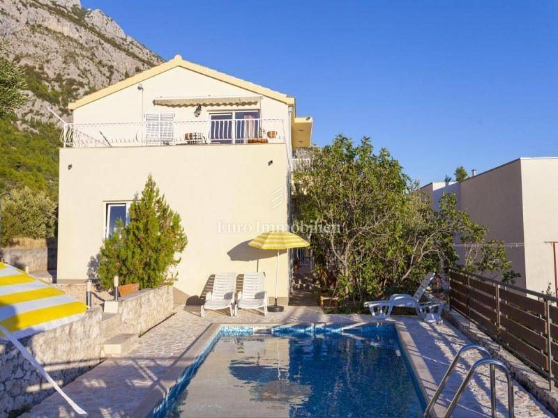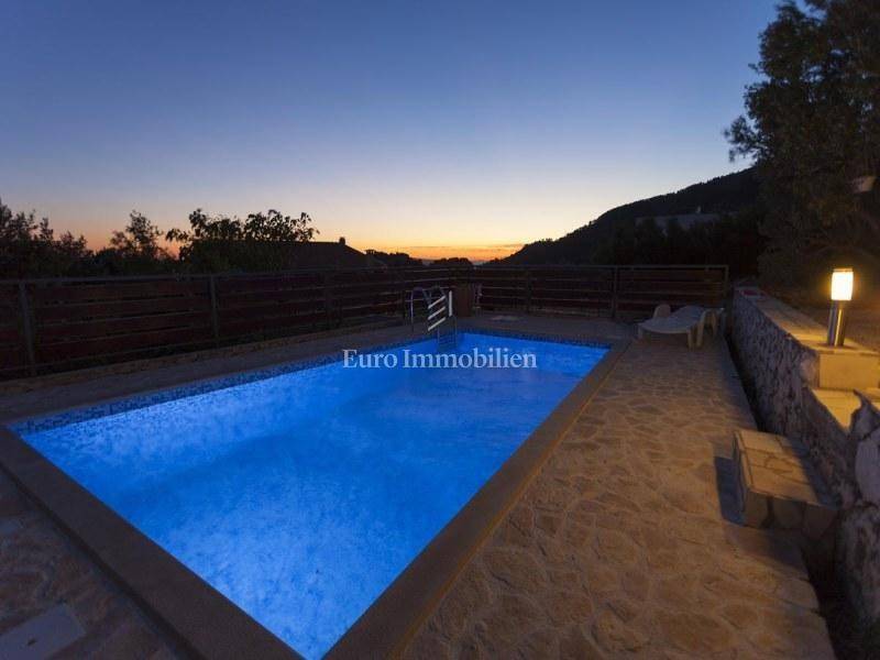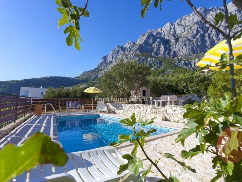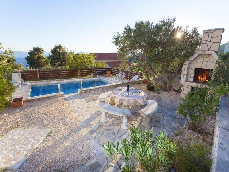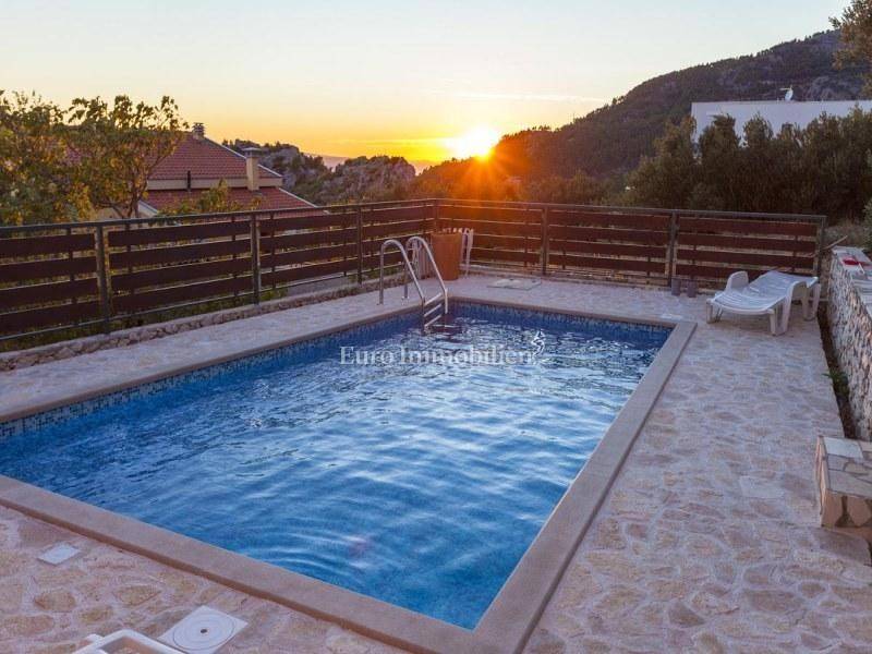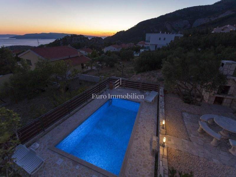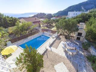 Beautiful house with pool and beautiful views of the sea and islands in Veliko Brdo (Makarska). The house is newly built, the total area of ​​the house is 208 m2 (ground floor and first floor), and was built on a plot of 491 m2. The ground floor has a kitchen, living room and dining room, pantry, bathroom, hallway, summer kitchen with bathroom, spacious terrace, cultivated garden, yard with built-in stone fireplace and outdoor pool of 30 m2. The first floor consists of 4 bedrooms, one bathroom and three spacious balconies. The house is completely south oriented and from every corner of the house there is a beautiful view of the sea and islands. The highest quality materials were used in the construction. Superior thermal and sound insulation, air conditioning, exterior PVC joinery, parquet, high quality ceramics, fully equipped bathrooms, satellite TV and internet connection. The house is ready to move in immediately, it is fully furnished, and as such it is for sale. It is located in a quiet place Veliko Brdo, at the foot of the mountain Biokovo, about 1 km above the town of Makarska. The house has great potential in terms of tourism. Parking for 4-5 cars is located in the yard on the north side of the house.