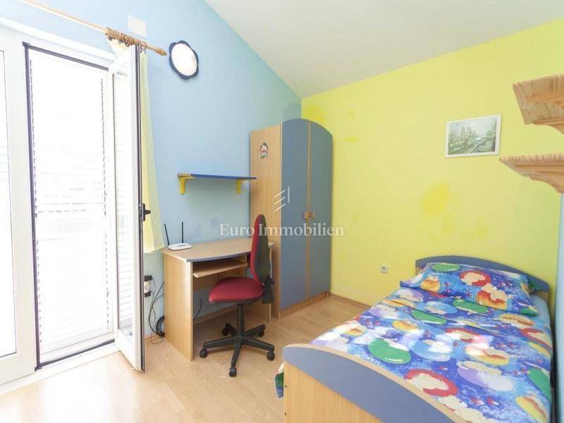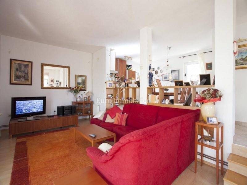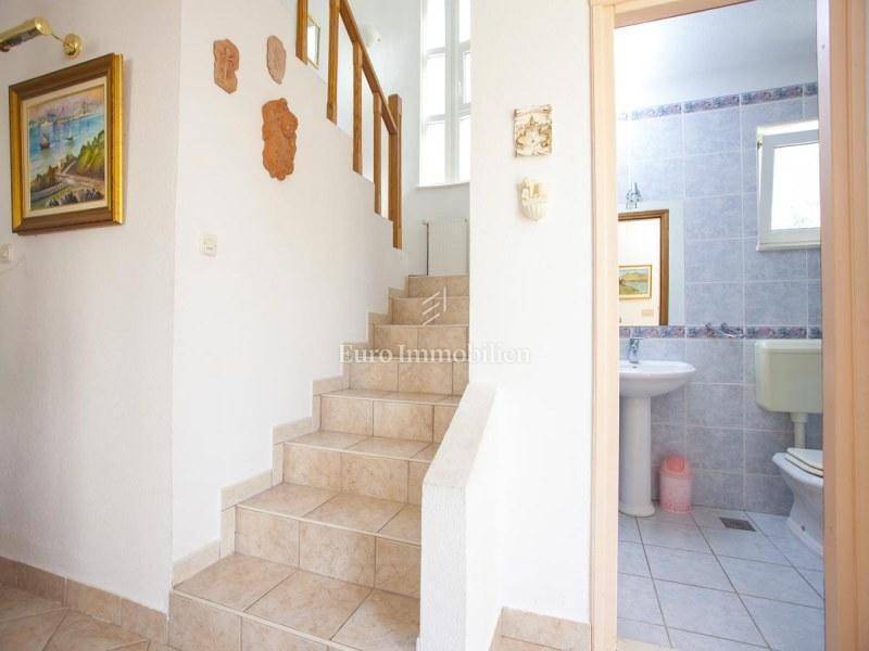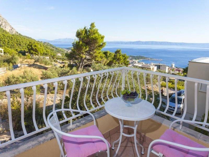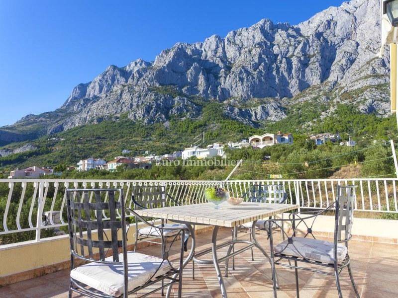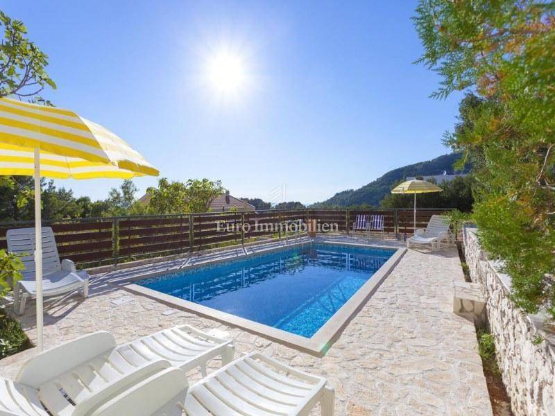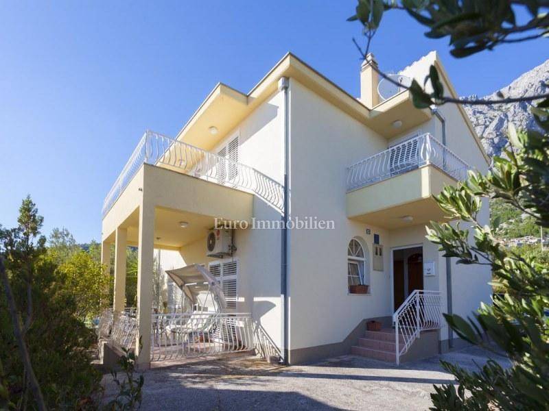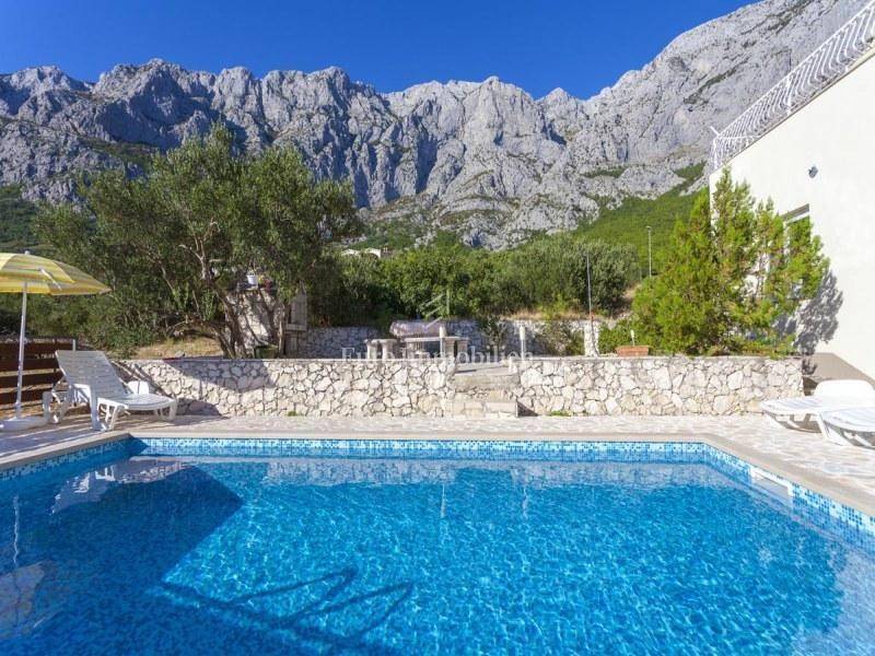 Beautiful house with pool and beautiful views of the sea and islands in Veliko Brdo (Makarska). The house is newly built, the total area of ​​the house is 208 m2 (ground floor and first floor), and was built on a plot of 491 m2. The ground floor has a kitchen, living room and dining room, pantry, bathroom, hallway, summer kitchen with bathroom, spacious terrace, cultivated garden, yard with built-in stone fireplace and outdoor pool of 30 m2. The first floor consists of 4 bedrooms, one bathroom and three spacious balconies. The house is completely south oriented and from every corner of the house there is a beautiful view of the sea and islands. The highest quality materials were used in the construction. Superior thermal and sound insulation, air conditioning, exterior PVC joinery, parquet, high quality ceramics, fully equipped bathrooms, satellite TV and internet connection. The house is ready to move in immediately, it is fully furnished, and as such it is for sale. It is located in a quiet place Veliko Brdo, at the foot of the mountain Biokovo, about 1 km above the town of Makarska. The house has great potential in terms of tourism. Parking for 4-5 cars is located in the yard on the north side of the house.