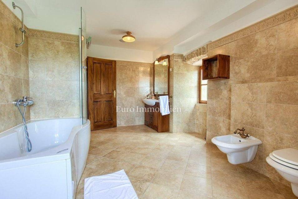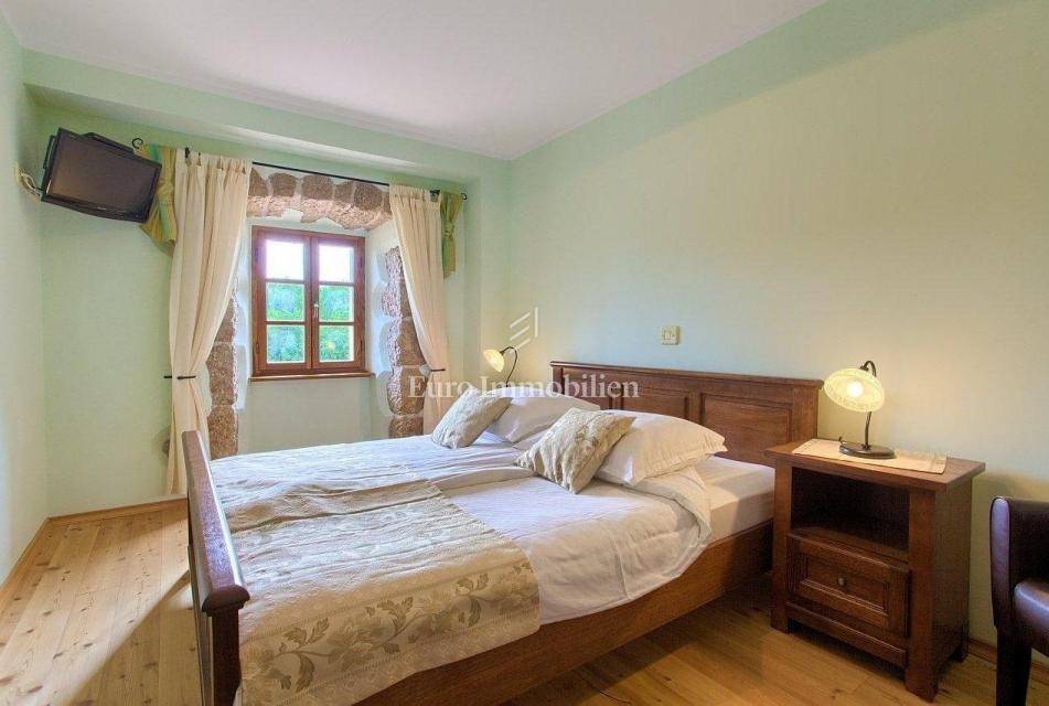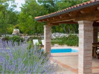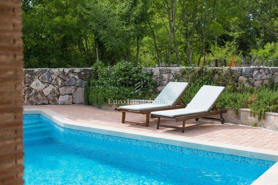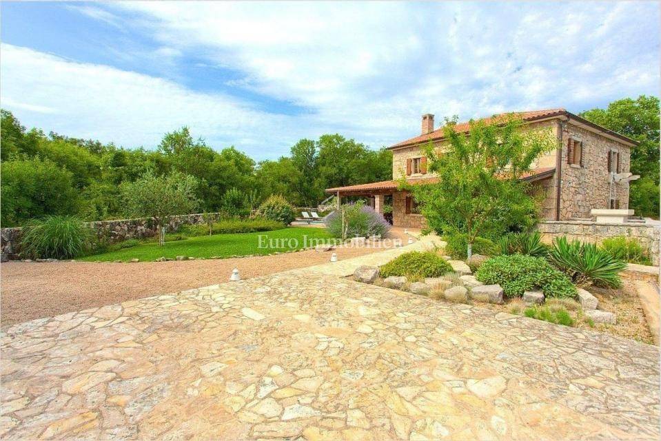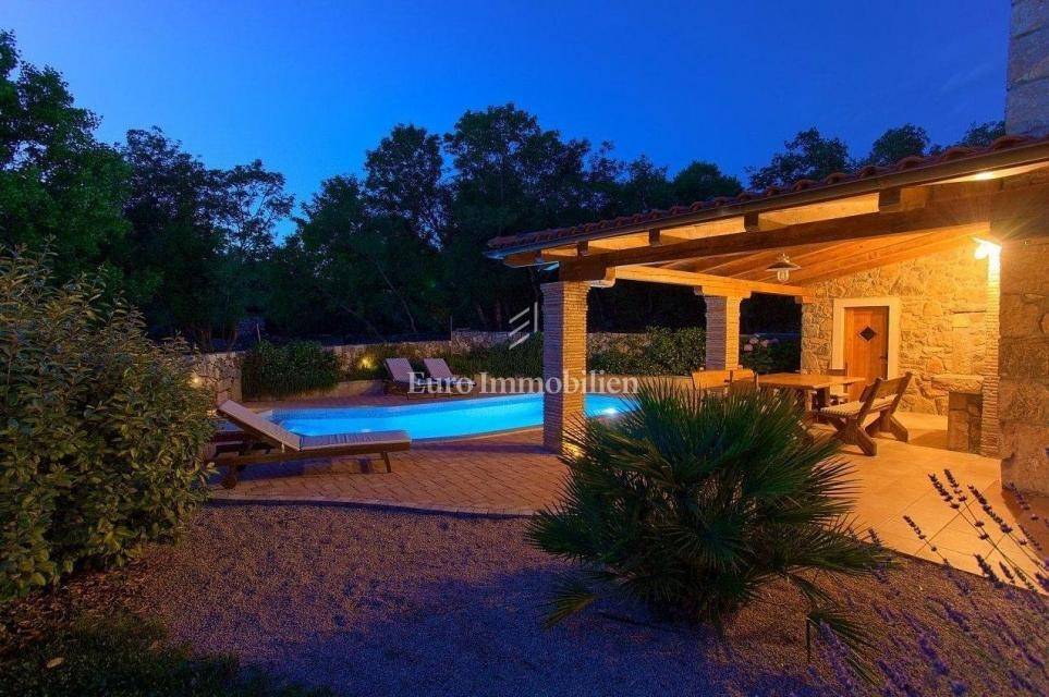 The island of Krk, Dobrinj area, renovated authentic old stone villa with beautifully landscaped garden and pool. The villa of 160 m2 of living space consists of the ground floor and first floor. The ground floor consists of a spacious living room with fireplace, kitchen and dining room, bathroom, toilet and a covered terrace. Upstairs are three bedrooms and bathroom. The villa is furnished, air conditioned, has underfloor heating, high quality ceramics and sanitary ware, video intercom, indoor and outdoor fireplace. The garden of 600 m2 is surrounded by original stone wall. The villa is located in a beautiful, quiet location 4 km from the sea.