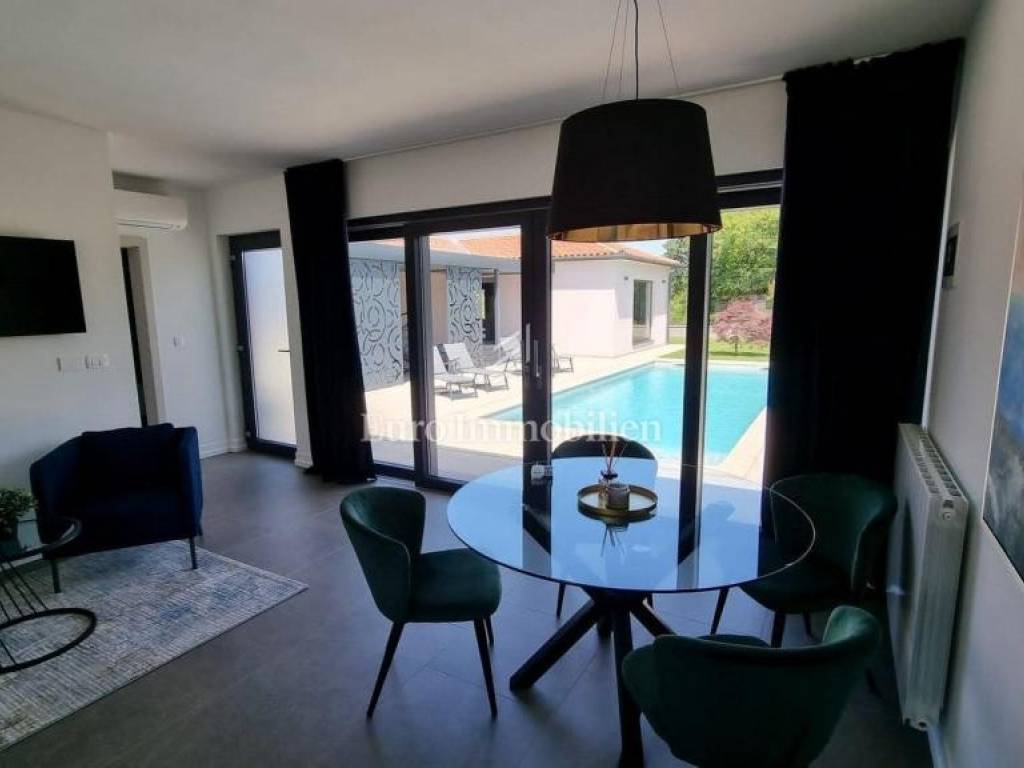 The villa with a living area of 178 m2 extends to the ground floor and consists of a spacious and modern living room, a fully equipped kitchen with storage, access to a large terrace, three bedrooms - each with its own bathroom and one additional bathroom. The beautifully landscaped garden area of 1,109 m2 has a jacuzzi, a swimming pool with a sunbathing area, a parking lot, and an auxiliary building, i.e. a studio apartment of 34 m2. The apartment consists of a kitchen, one bedroom and a bathroom.