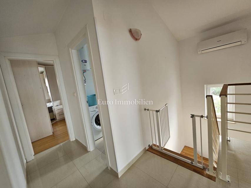 The apartment of 100 m2 is divided into the first and second floor. On the first floor is a spacious living room with an exit to the loggia with partial sea view, a kitchen with dining area and a bathroom. On the second floor is a hallway, one bathroom and three bedrooms, two of which have access to a loggia with an open sea view. Internal staircase connects the two floors.