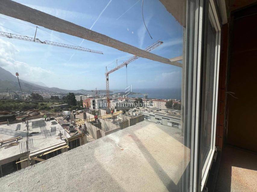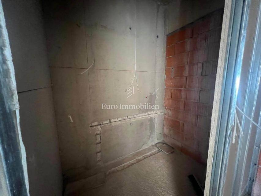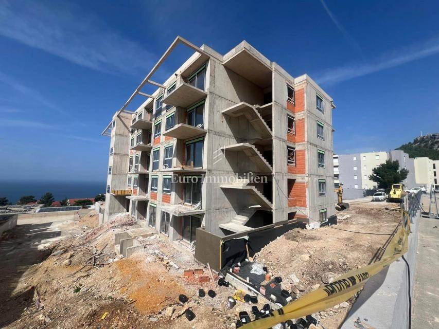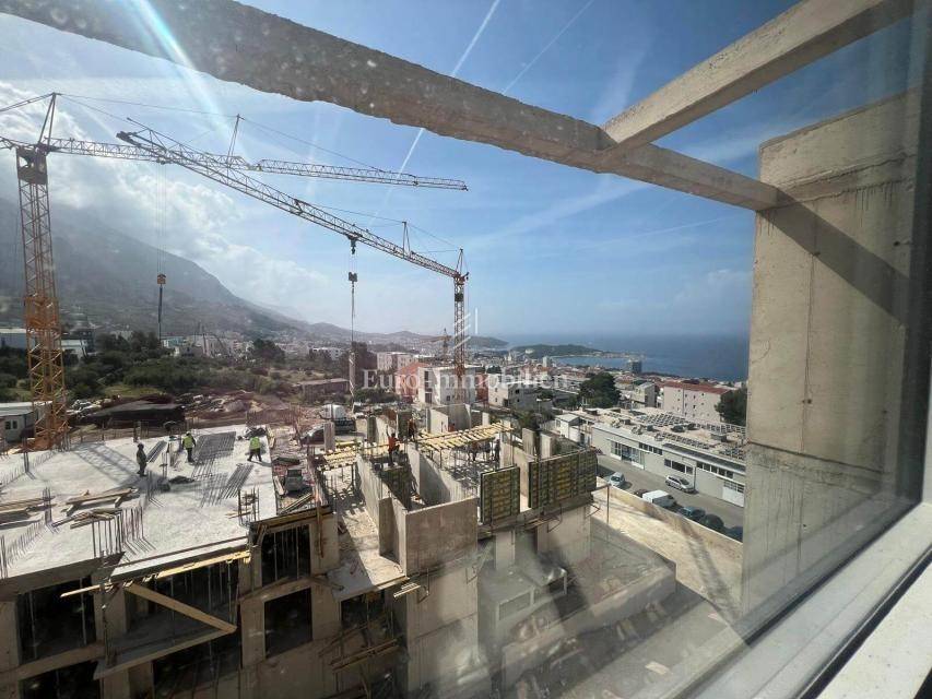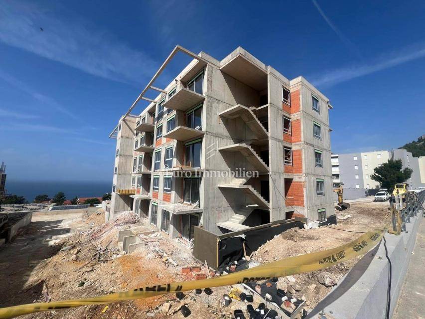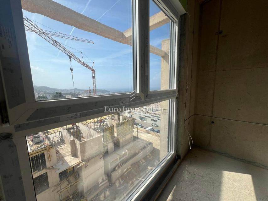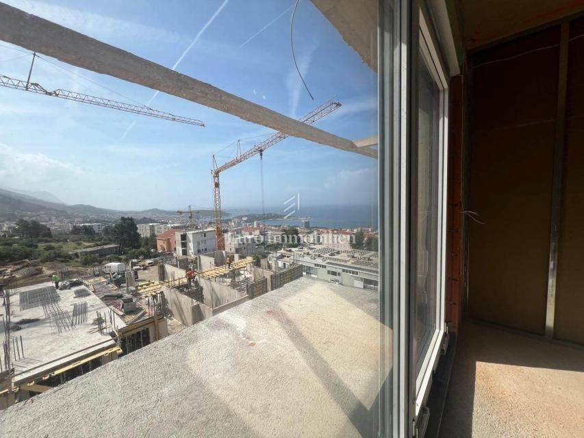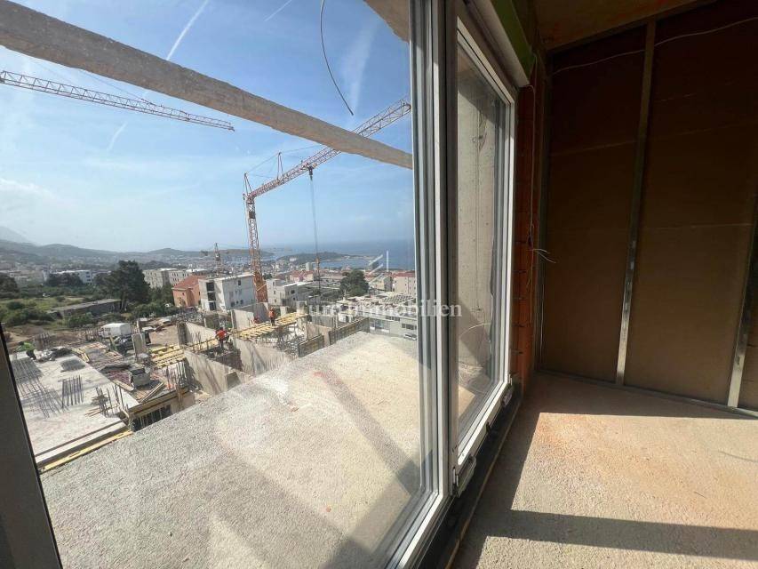 The apartment is located on the fourth floor of a residential building, has an area of 66.17 m2 and consists of two bedrooms, a kitchen and a living room with a dining room, a bathroom, a toilet and a balcony of 7.60 m2 with sea view.