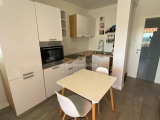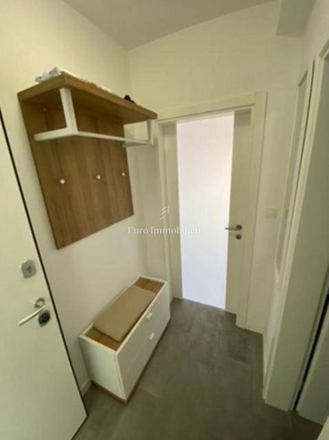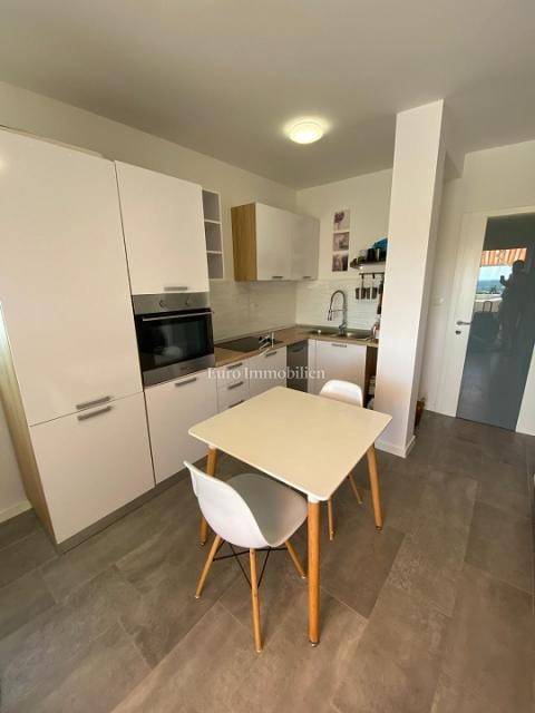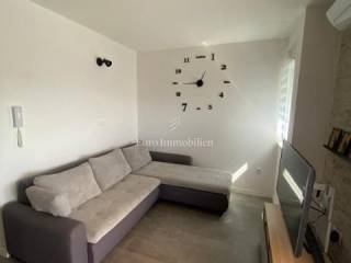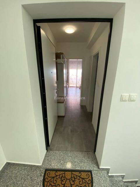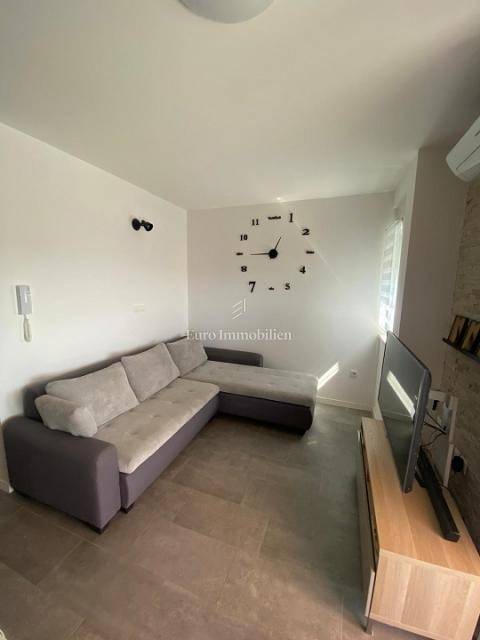 It consists of two hallways, a bedroom, a bathroom and a living room with a kitchen. It has a loggia and a terrace with a sea view. It is furnished and air-conditioned. The apartment also comes with a parking space in the yard.