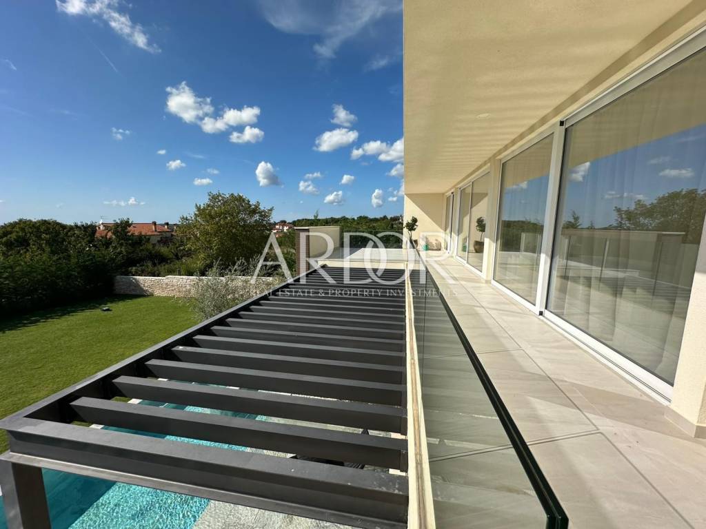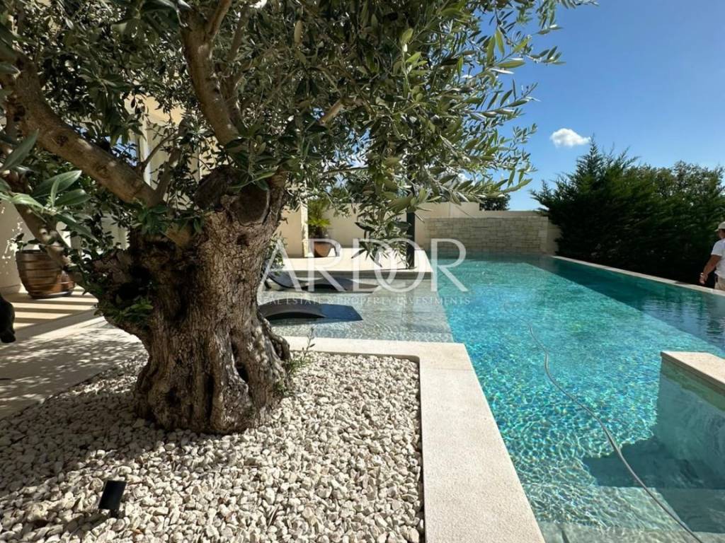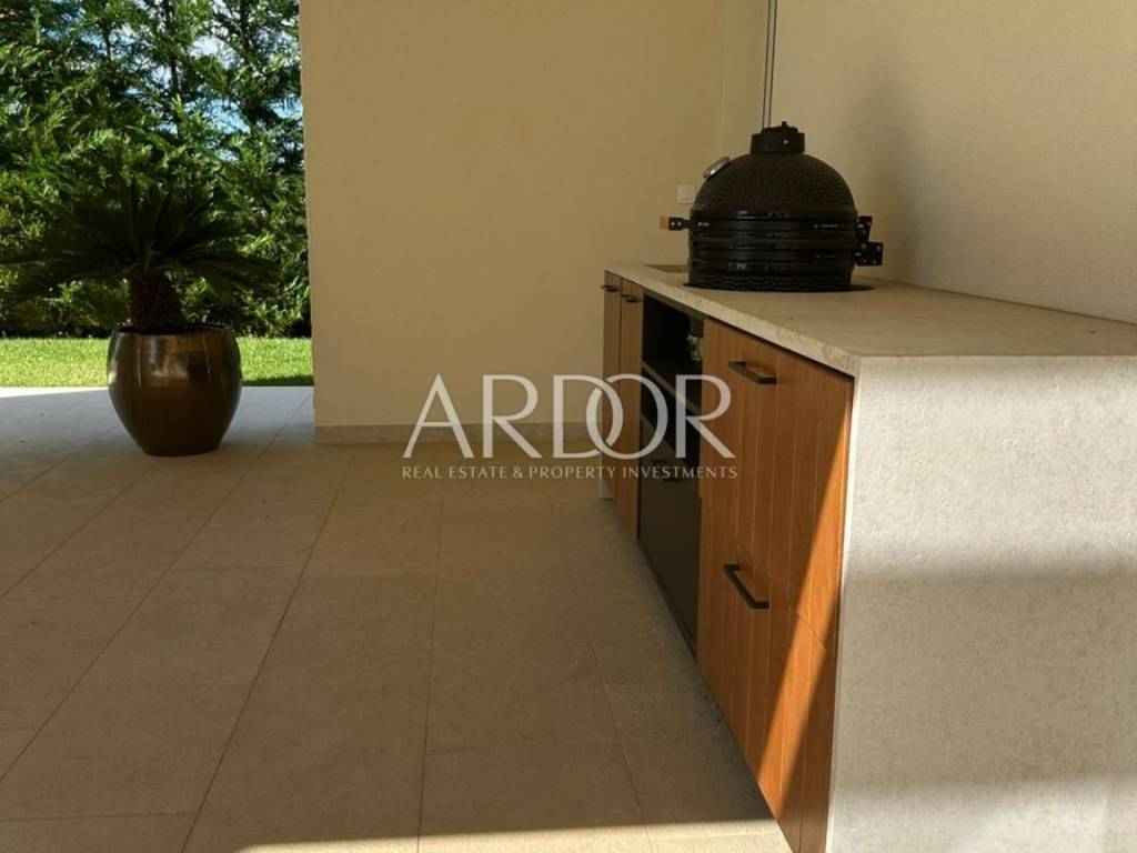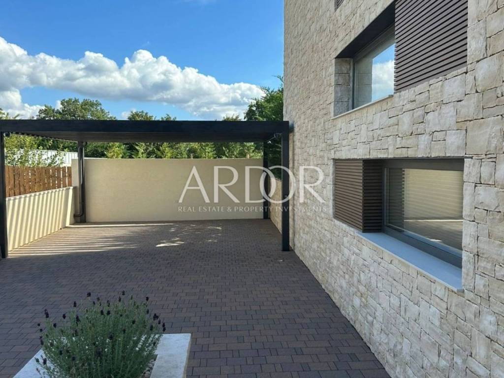 Kanfanar – A modern villa of 276 m² is situated on a 1,020 m² landscaped plot with a well-maintained lawn offering numerous possibilities – from creating a tennis or mini golf court, a children’s playground, or simply enjoying the spacious green area.