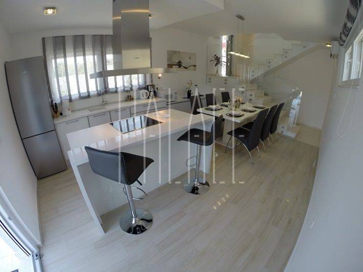 For sale is a villa of an atypical shape located on the western side of the island of Čiovo. The house was renovated in 2019, it consists of a living room, a kitchen with a dining room, three bedrooms with a heating system, four bathrooms, a fitness room and a balcony with a beautiful view. In front of the villa there is a barbecue and a swimming pool for relaxation, and on the north side of the house is its own parking lot. The villa is located in an excellent location, close to the sea, the beach, as well as the town of Trogir and other facilities in the area. The nearest beach is 150 meters from the sea. The property is neat and unencumbered.