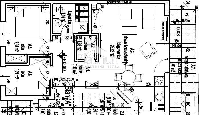 Near Fažana, two-room apartments under construction for sale. The building will consist of a ground floor, first and second floors and attic. The apartments will have a net area of 34.28 m2 to 70.67 m2. Each apartment also has a parking space according to the coefficient of 3.13 m2. Estimated completion date is 1