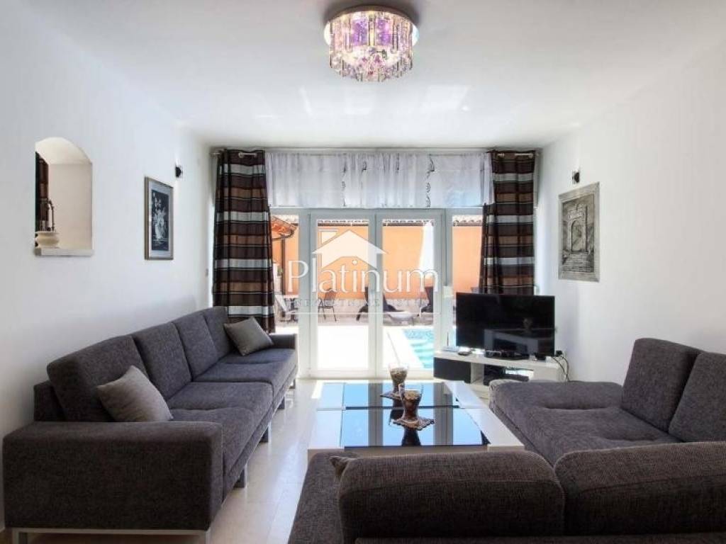 Prodaje se kuća s bazenom na tri etaže u Medulinu ukupne površine 380 m2. U prizemlju je veliki dnevni boravak sa kaminom, kuhinja i blagavaona, spavaća soba s kupaonom. Izlaz na bazen je omogućen iz dnevnog boavka kao i spavaće sobe. Na prvom katu su tri spavaće sobe svaka sa kupaonom i velika terasa na kojoj je jacuzzi. Dok su se na drugom na katu smjestile još dvije spavaće sobe sa zasebnim kupaonama. Okućnica je kompletno ograđena na kojoj je veliki bazen od 40 m2 pored kojeg je sunčalište i nakrivena terasa sa grillom. Udaljenost od mora 350 m.