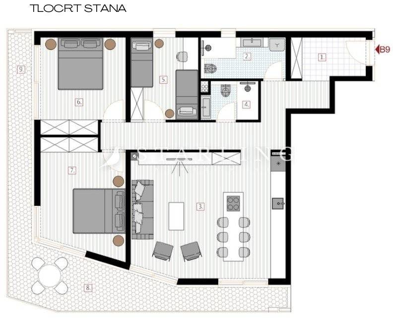 APARTMENT, SALE, NEW BUILDING, PULA, 104.74 m2 Luxury apartment with a total living area of 104.74 m2, in a fantastic location, first row to the sea, with a beautiful view of the sea. The apartment is located on the first floor of an urban residential building that has a total of thirty-six apartments. The apartment consists of an entrance hall with a wardrobe, two bathrooms. living room with kitchen and dining area, three bedrooms, and a covered terrace. The apartment is sold on a 'turnkey' basis, with a fully equipped bathroom (with associated furniture and sanitary ware), with floor coverings in all rooms together with white walls and ceilings, with all electrical installations and installed air conditioners, and installed all internal and external carpentry. The assembled entrance door will be anti-burglary and fire-proof. Also, the apartment will have an antenna system as well as a UTP network. Apart from the bathroom, the apartment is sold unfurnished. Parking space is paid additionally. All parking spaces are located in the underground levels of the building. Also, with the apartment, it is possible to buy a storage room with an additional charge. The storage rooms are located on the same levels as the parking spaces. Completion of the construction is planned for the middle of 2024. Heating/Cooling: air conditioning in all rooms. Orientation: west. Distance from the sea: 50 m. Ownership: 1/1, unencumbered. Price: 589,200 euros.