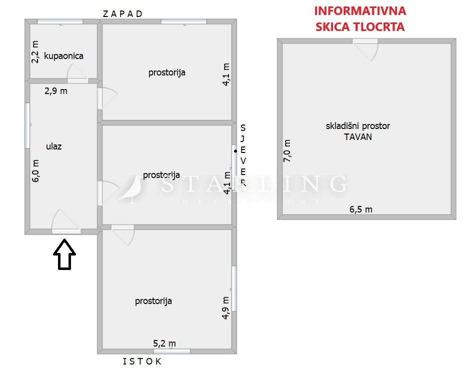 U prizemlju kuće se nalaze 4 prostorije i kupaonica, a tavan je moguće iskoristiti kao skladišni prostor. Kvadratura tavana nije iskazana u ukupnoj kvadraturi kuće.