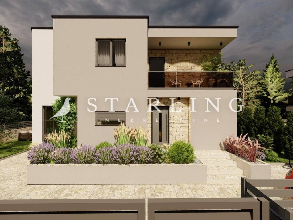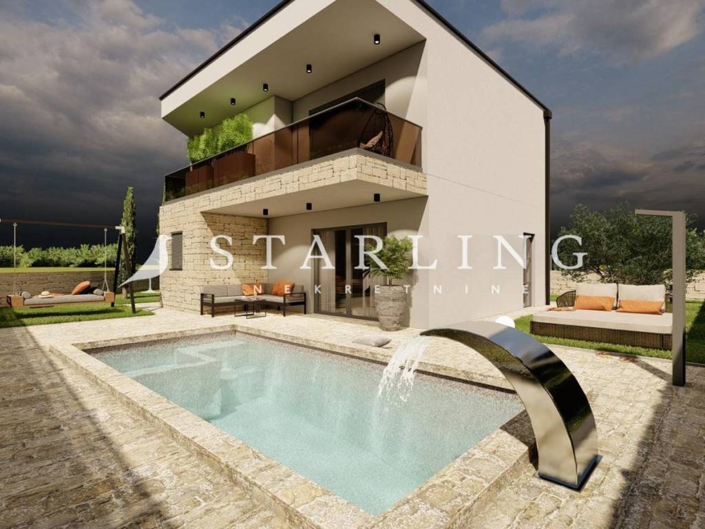The villa is envisioned as a blend of modern architecture and traditional Mediterranean style with clean lines, built using both modern and traditional materials such as stone, wood, and concrete.