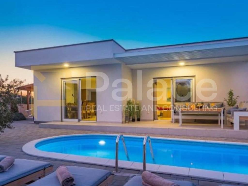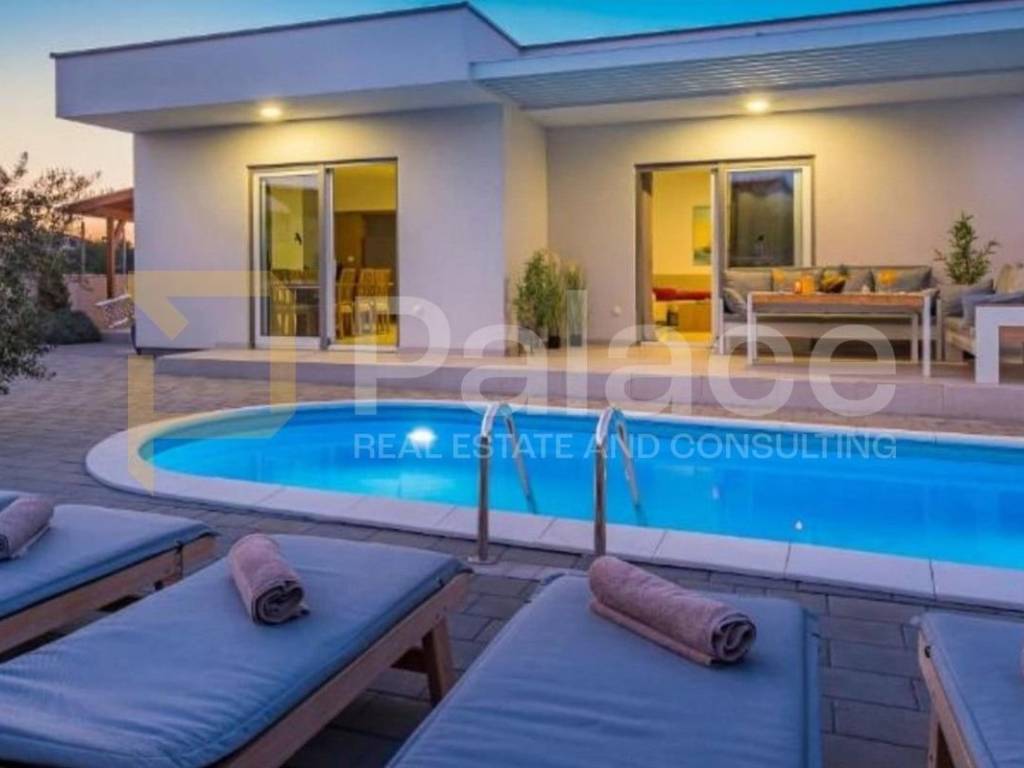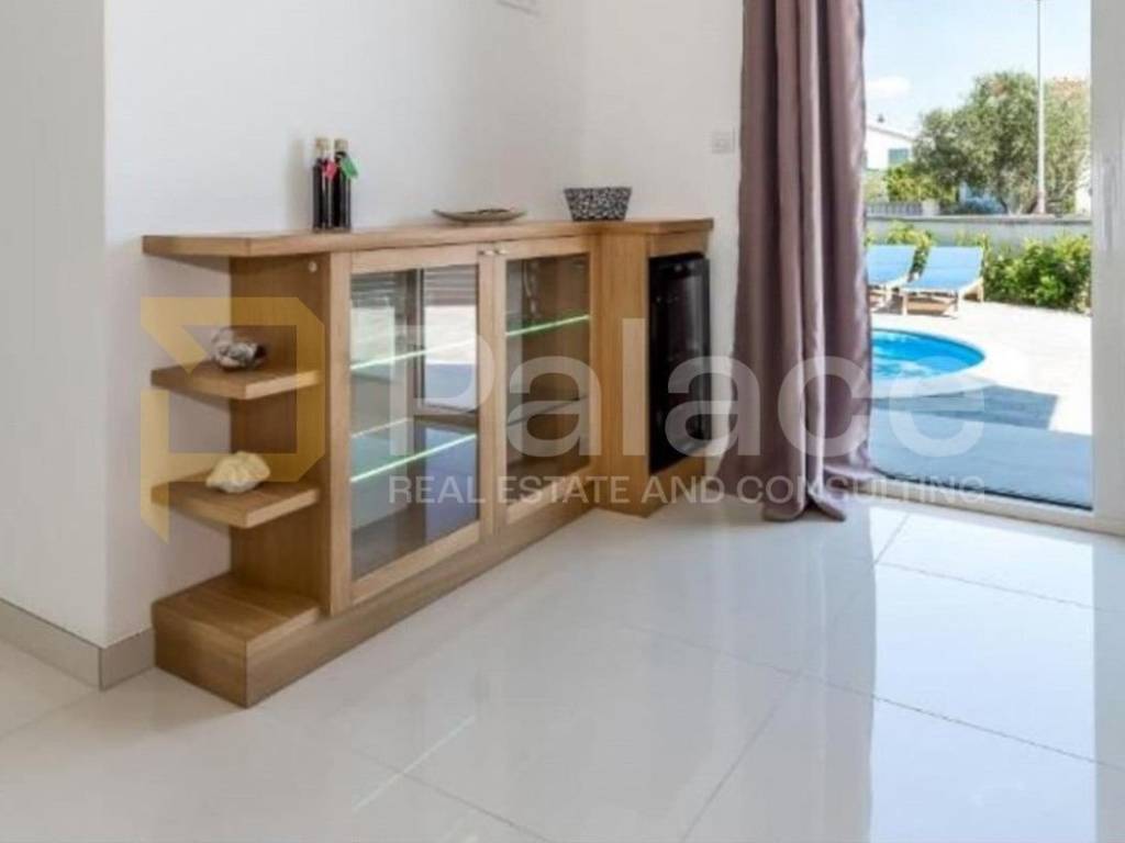 The plot has a total area of 449 sqm and features a beautiful pool, barbecue, covered socializing area, and several olive trees.