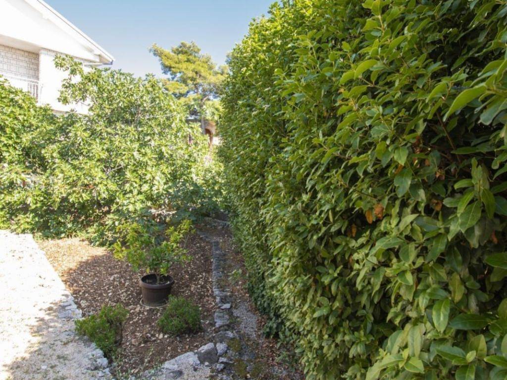 Inside the landscaped garden, which is approached from the road, and leads to a wide paved road with unmarked and uncovered parking spaces, there is a garage and a garden that offers shelter and a dose of privacy with its greenery.