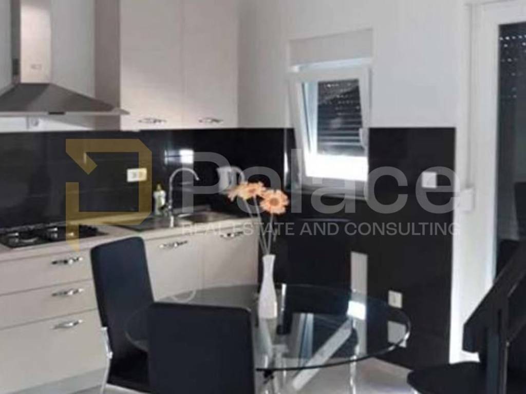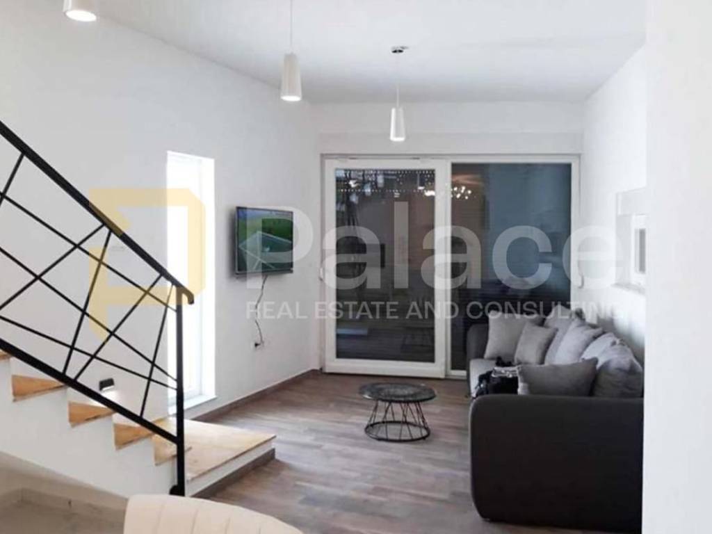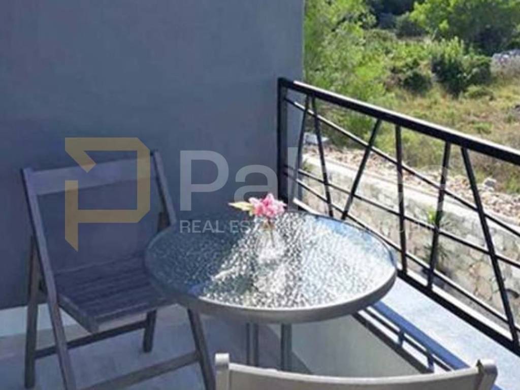 The first residential unit has a living room with a kitchen and dining area on the ground floor, where the bathroom is located as well. The first floor features two harmoniously decorated rooms, a spacious balcony, and another bathroom.