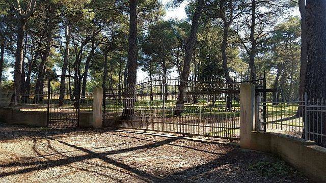 Parcela je kompletno ograđena betonskim zidom, kovanom ogradom i velikim kovanim kliznim vratima od 7 m. .