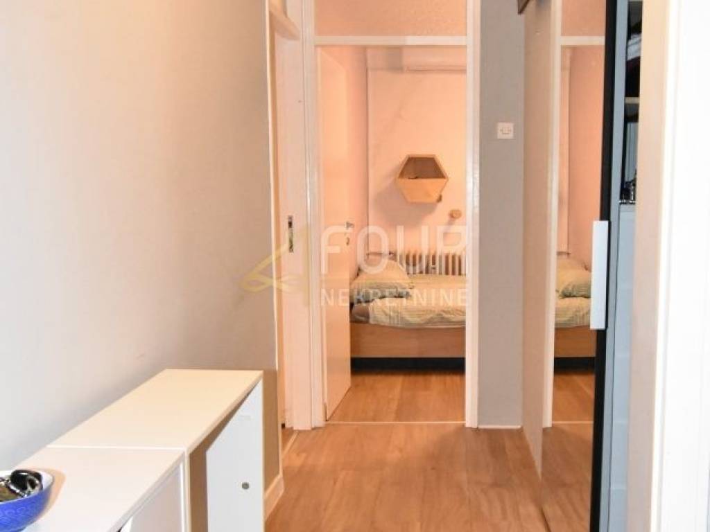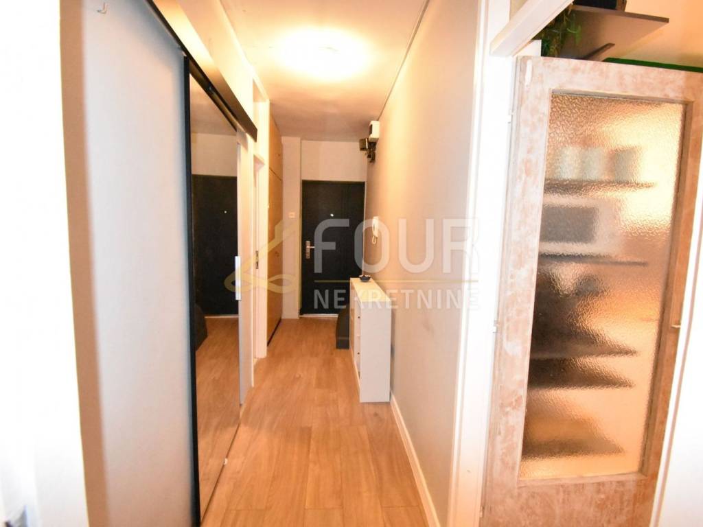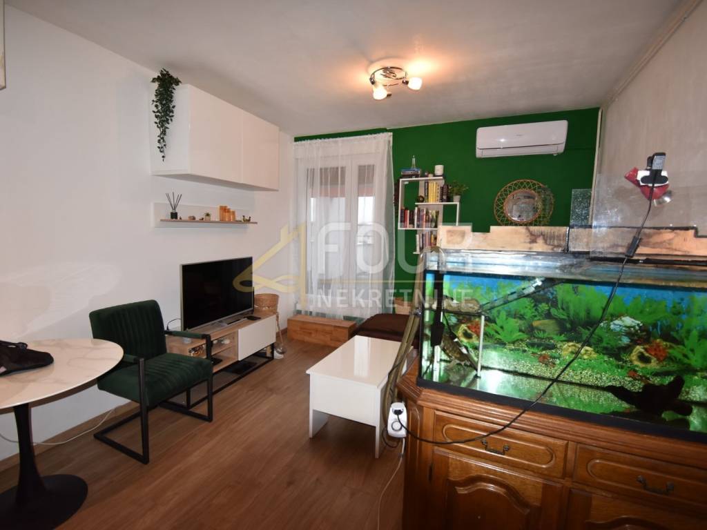 An apartment is for sale in an attractive location in Turnić, with a total area of 42.01 m2, located in a residential building with an elevator. It is oriented towards the sea and consists of a bedroom, a living room connected to the kitchen and dining area, a bathroom, a hallway, a storage room or built-in wardrobe, and a balcony. It was partially renovated in 2020, when the entrance doors were changed, laminate floors were installed, PVC joinery, a new kitchen, and air conditioning. It has security doors, an internet connection, and central heating with additional heating and cooling through air conditioning.