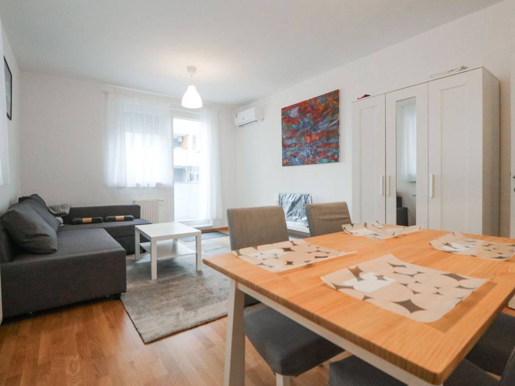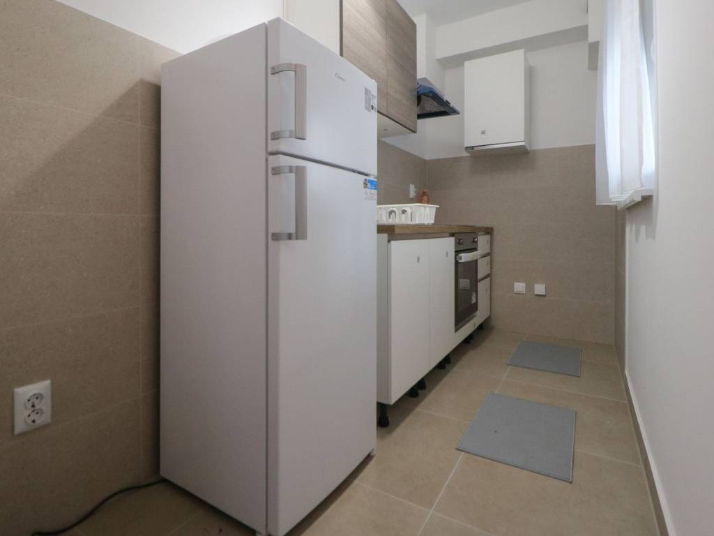Stan je potpuno namješten i opremljen je klima uređajem, protuprovalnim vratima, PVC stolarijom, ormarima u sobi i u hodniku, ormarićem u kupaonici, TV-om, pećnicom, napom, hladnjakom sa zamrzivačem, indukcijskom pločom, video portafonom, udobnim kaučem na razvlačenje, tuš kabinom, toaletom i sl.