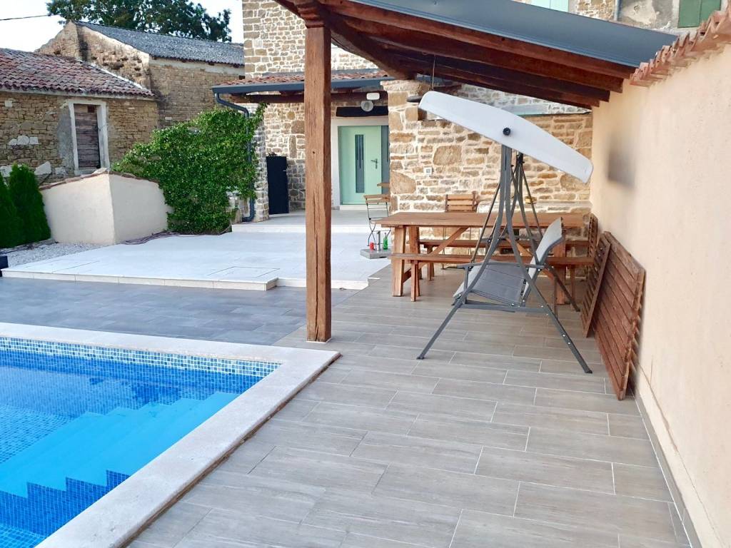 Located in a peaceful Istrian village near Motovun, this fully renovated authentic Istrian stone house with a swimming pool offers a perfect blend of traditional charm and modern comfort. The property consists of a main residential unit currently used for tourist rental, as well as an additional, separate residential unit with a private entrance from the rear of the house. The renovation preserved the rustic character of the property, featuring exposed stone walls and wooden beams, maintaining its authentic Istrian atmosphere. The fenced outdoor area includes a swimming pool, sun deck, and a covered terrace, ideal for relaxation and outdoor living during the warmer months.