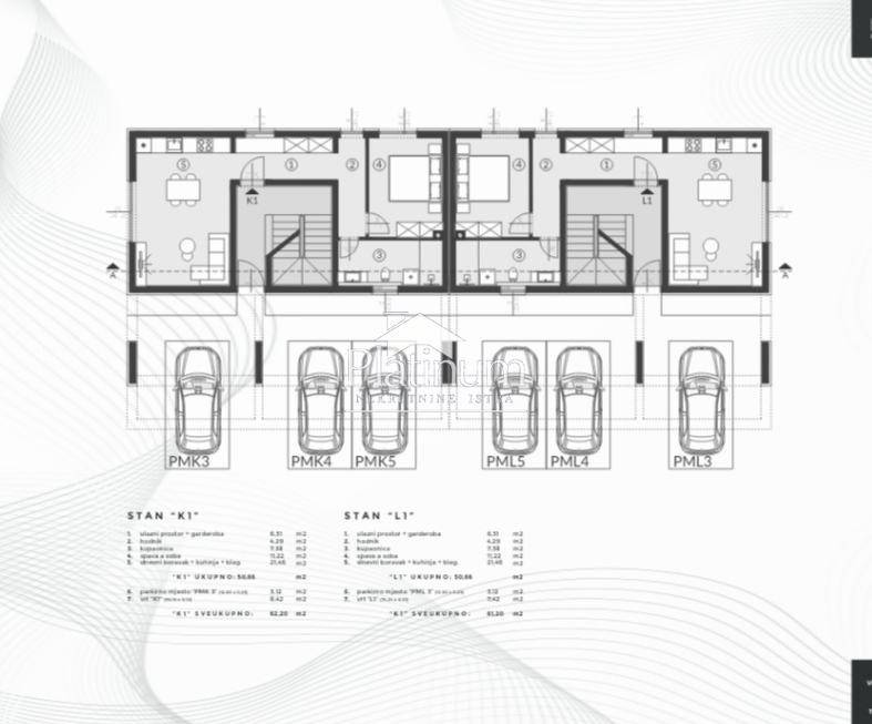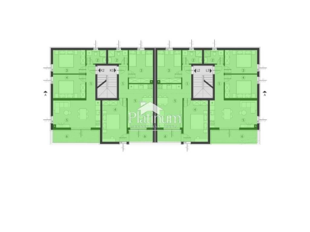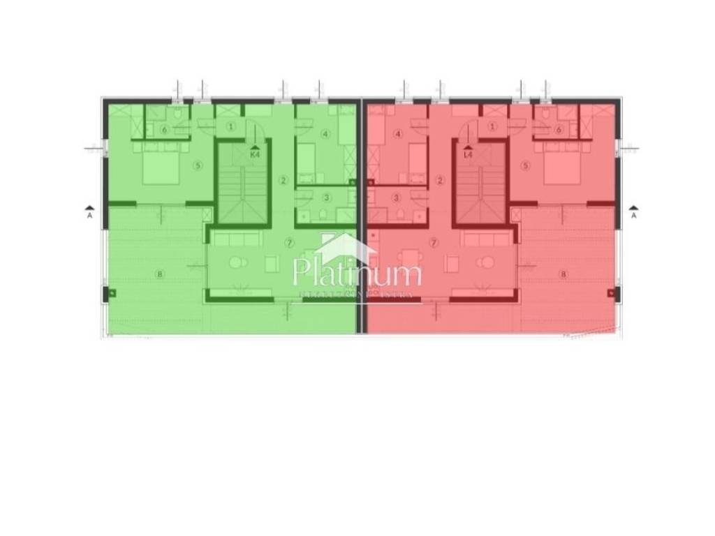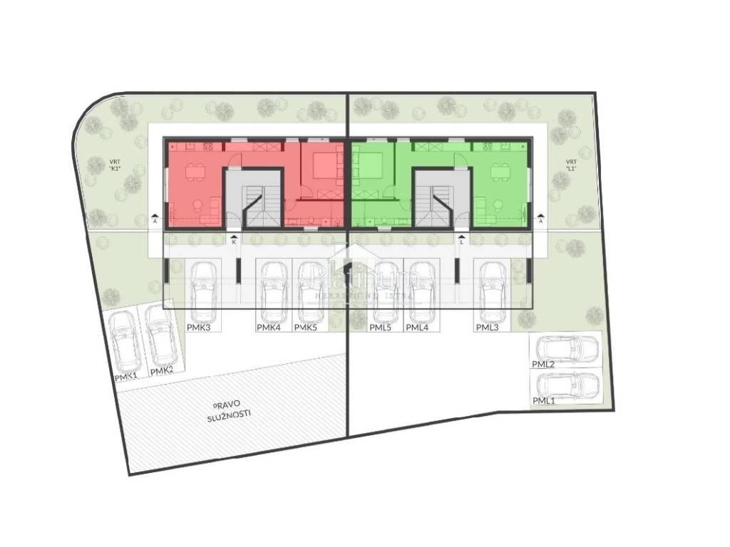 In the immediate vicinity of an elementary school, kindergarten, city beach Hidrobaza, pharmacy and only four kilometers from the center of Pula and three kilometers from the center of Fažana. The approach to the residential complex is provided with macadams (future asphalt roads), inside which all the necessary infrastructure (electricity, water, sewage) is located. Each housing unit is provided with the required number of parking spaces according to the urban plan of the city of Pula, measuring 2.50m x 5.00m. Parking spaces cannot be changed or omitted from the composition of the residential unit. A future connection to the power grid is planned for each parking space with the aim of connecting chargers for electric vehicles. We offer an apartment on the ground floor of 61.20 m2 with one room, a garden and a parking space. On the first floor, four apartments of size 56.77 m2 with two bedrooms, 56.66 m2 with two bedrooms. On the second floor, a beautiful apartment with two rooms, a bathroom and a toilet, size 94.22 m2 with a parking space. Info on 00385 91 924 9486