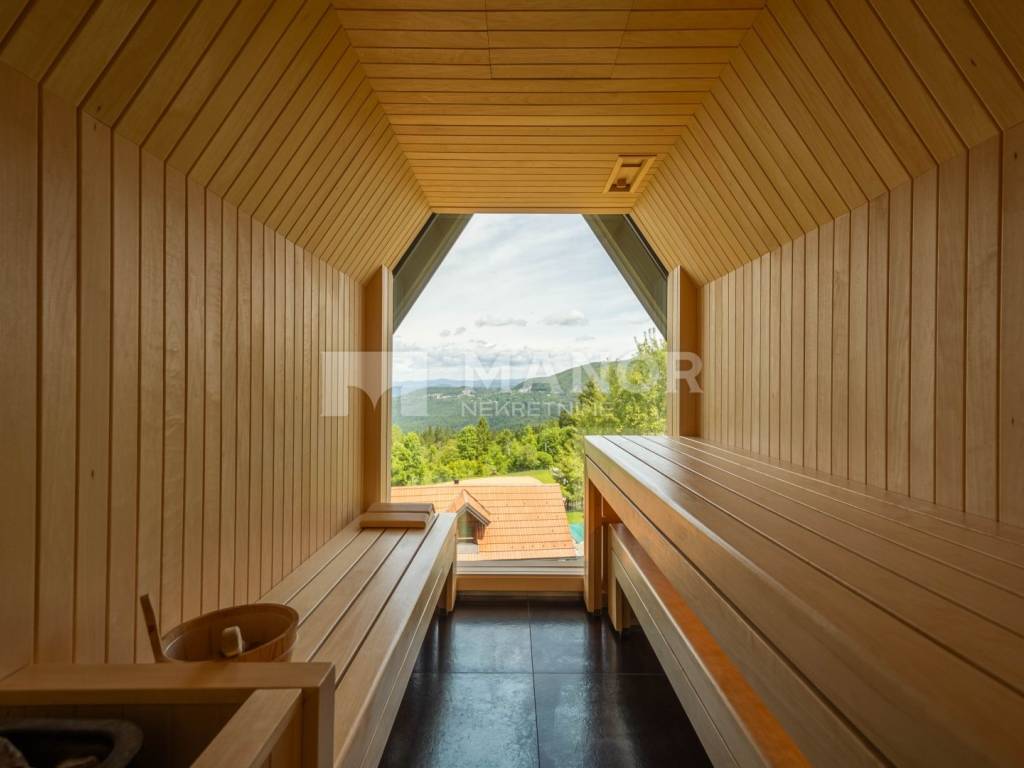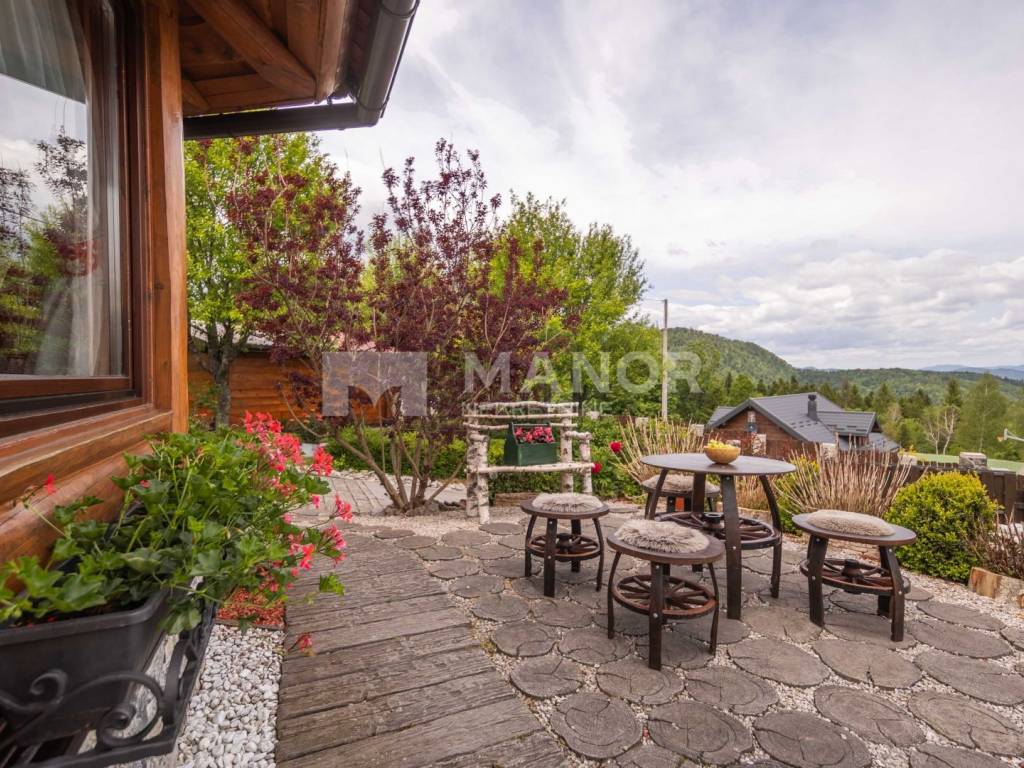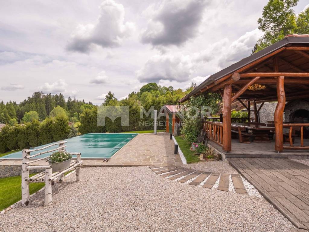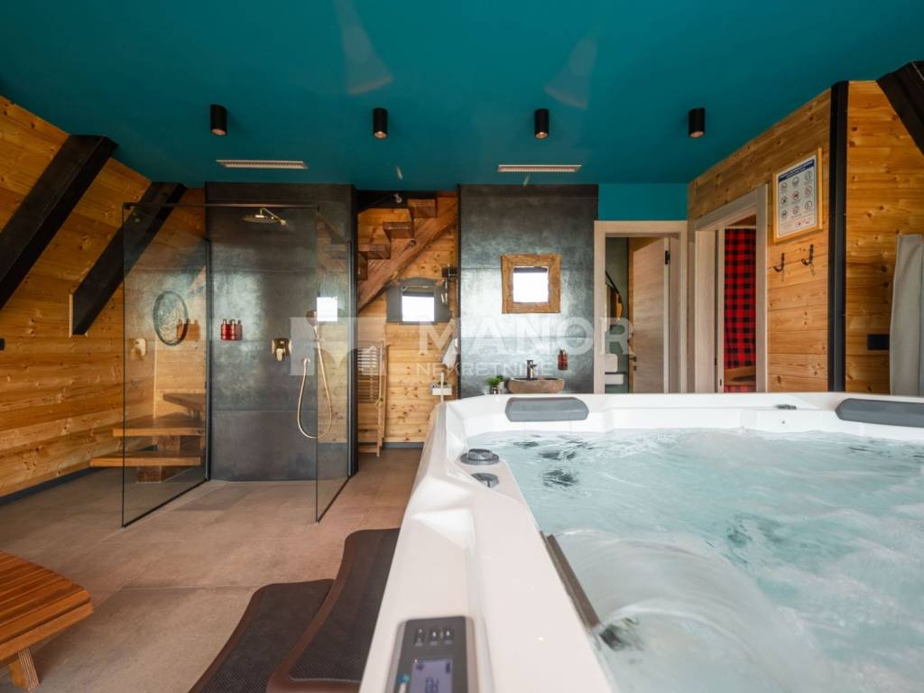 Manor presents a luxurious wooden villa with a pool and wellness area located at the top of a small village in the heart of Gorski Kotar, offering stunning panoramic views of forested slopes and the Slovenian Alps.