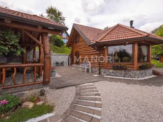The main house is a typical mountain chalet with two floors and a sloping roof.
