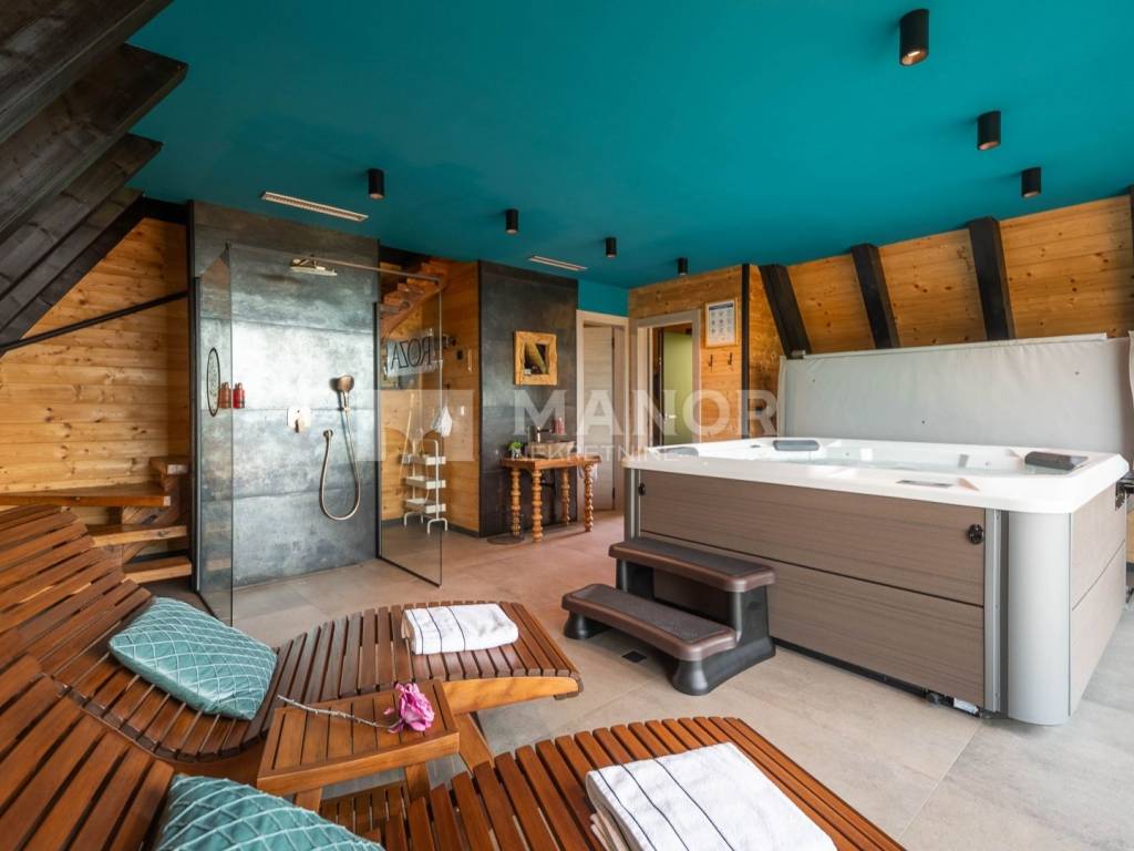 The ground floor features a jacuzzi, toilet, shower, and wardrobe, with a large sliding glass wall at the front. The sauna is located on the upper floor. The wellness area is perfectly designed for complete relaxation with beautiful views from every corner.