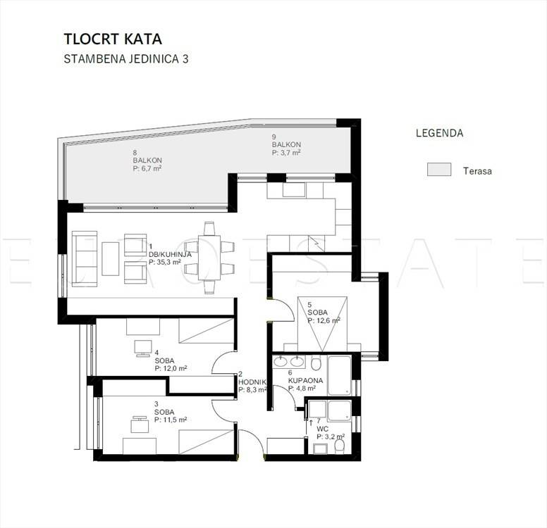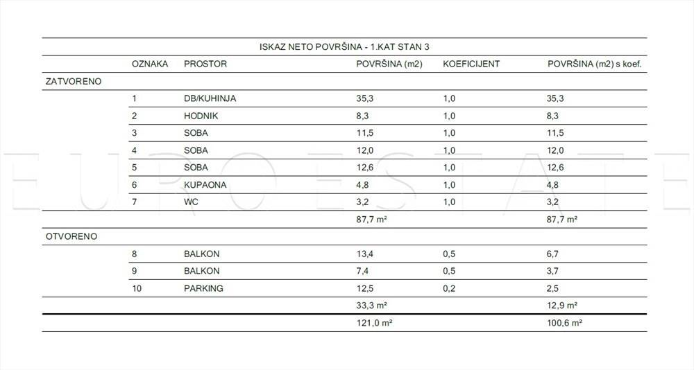 PRODAJE SE četverosobni stan u ekskluzivnoj novogradnji smješten na 1. katu urbane vile, ukupne površine 121 m2 i neto korisne (obračunske) površine 100.60 m2.