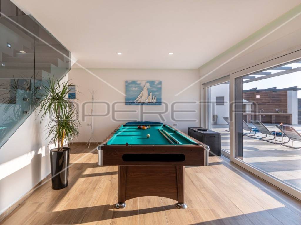 On the ground floor there is a living room with a kitchen and a dining room with access to the terrace and the pool"s sunbathing area, an entrance hall with a billiards table, a room with a bathroom, a storage room and a toilet.