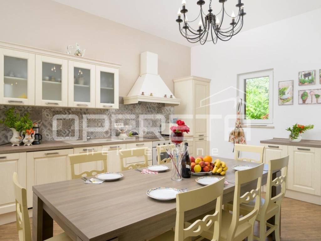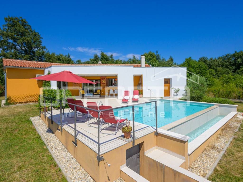 For sale is an attractive modern villa located in the heart of central Istria, in a peaceful setting not far from the magical medieval town of Svetvinčenat. This elegant single-storey house, built in 2018, is characterized by contemporary architecture and a carefully decorated interior that exudes style and sophistication. The villa is located on a plot of 1,059 m², while the living area itself is 170 m².