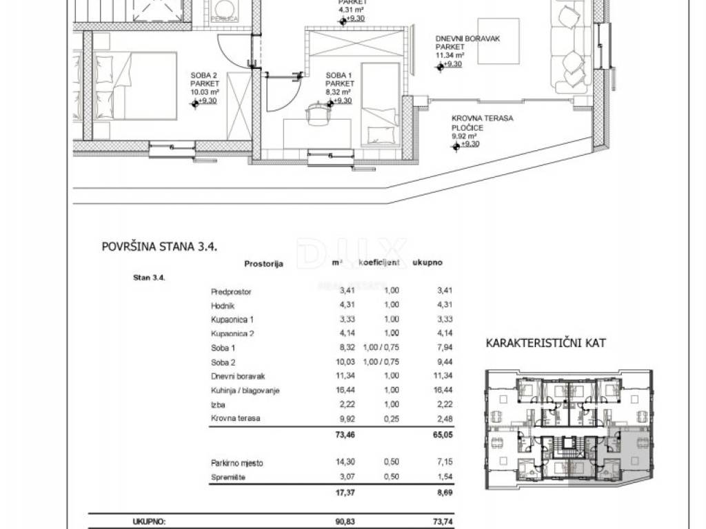 We are selling a two-bedroom apartment with a living room marked 3.4 on the third floor of a top new residential building in a phenomenal and unique location. The apartment consists of an entrance hall, utility room, guest toilet, bathroom, open space concept living area with kitchen and dining room with access to the roof terrace and two bedrooms which also have access to the roof terrace with a total net living area of 74m2. The apartment comes with one garage parking space measuring 14.30m2 as well as a storage room in the garage measuring 3.07m2.