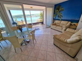 The apartment spans over two floors, high ground floor and attic and has open sea view from both floors. On the high ground floor is an entrance hall, a living room with a kitchen and dining area, a bedroom, a bathroom and a loggia with sea view. On the loggia is a barbecue. On the upper floor is a large bedroom, a fitness room with a jacuzzi, an electrical connection for a sauna that can be built in, as well as a terrace with a shower and an open sea view. There are mosquito nets on the balcony doors, and both floors are air-conditioned. The apartment was renovated in 2022, it is being sold fully furnished and ready for use. There is a children's playground and a grill with table and benches on the common yard. A parking space is also provided. All amenities are within walking distance from the apartment.