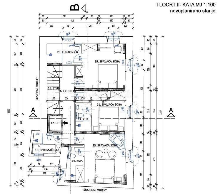 The house consists of a ground floor and three upper floors. According to the existing architectural project, the planned layout is as follows: