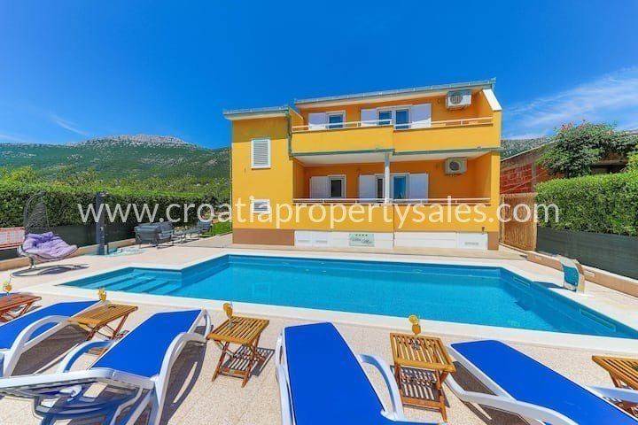 A wonderful charming villa in an accessible location in Kaštela.The total living area of the villa is 300 m2, and it consists of two floors.It can be seen as two separate residential units, which are fully equipped.The ground floor consists of a kitchen, a living room, two bedrooms, a bathroom and a small toilet, and has direct access to the swimming pool and sunbathing area. The first floor has an identical layout.The house also has additional storage, a fireplace and space for socializing, and a corner for children's entertainment.The property has one garage space and 3 outdoor parking spaces.The distance to the nearest airport is 7 km.