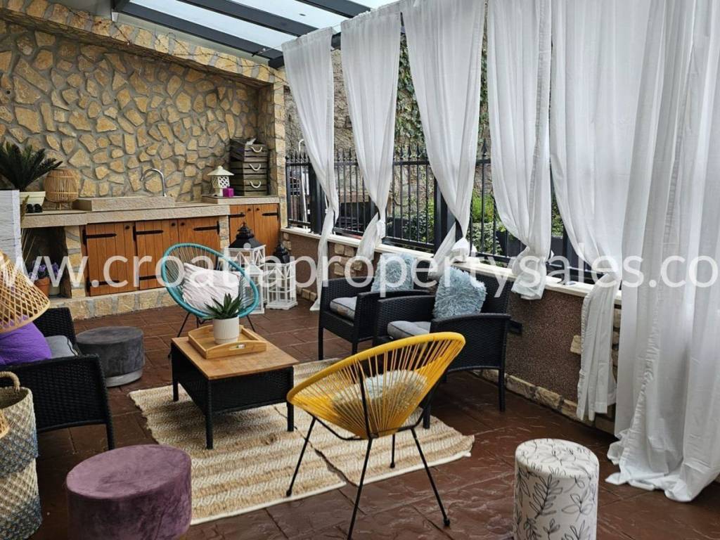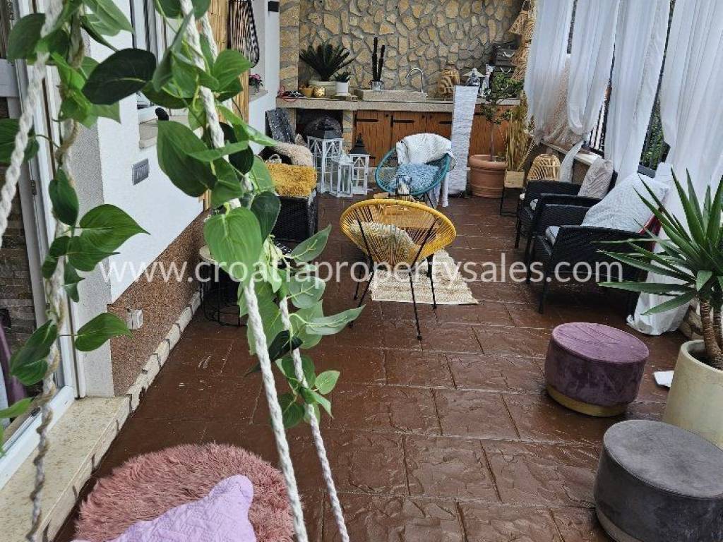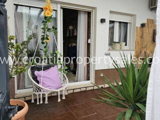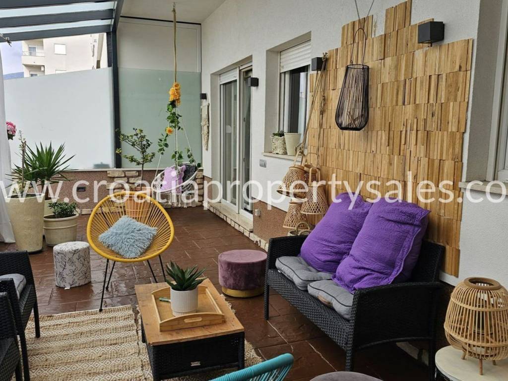Luxurious and modern apartment in a new building with garage parking space.The apartment is 59 m2 and is located on the ground floor and has two private entrances.It consists of a hallway with built-in wardrobes, a living room with a kitchen and a dining room, two bedrooms and a bathroom.The living room leads to a large covered terrace of 28 m2. There is outdoor furniture and a kitchen on the terrace.It is possible to close that space and get more living space. The apartment is located in an extremely quiet location near beautiful beaches and promenades.It is ideal for tourism as well as for housing.There is a garage space in the basement of the building, and there are enough parking spaces in the public space nearby.