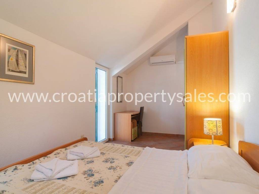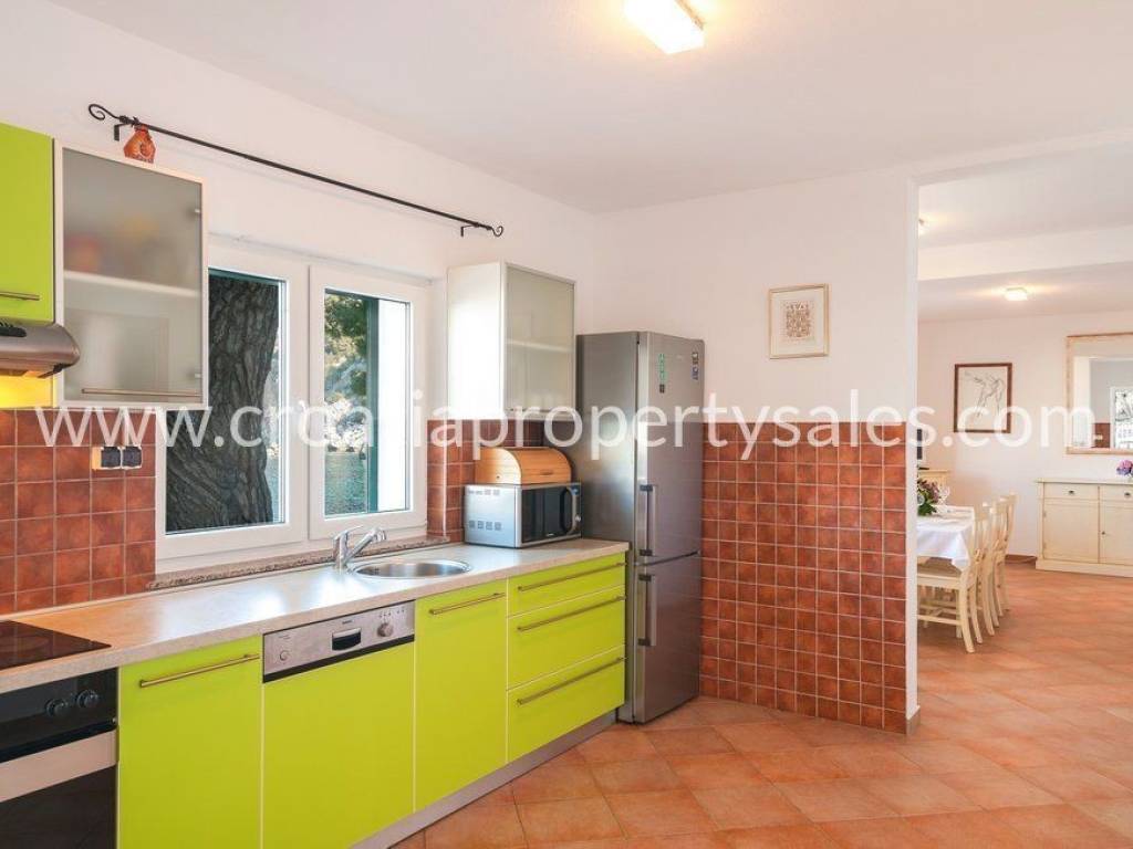 Detached house on two floors in a very attractive location.The house is located near a pebble beach, in the first row to the sea. On the ground floor there is a kitchen, dining room, living room and bathroom.This floor has access to a spacious terrace surrounded by tall pine trees that provide pleasant shade in the summer months.Internal stairs lead to the upper floor, where there are 4 bedrooms, a toilet, and an exit to the balcony with a unique view of the surrounding nature and the sea.The possibility of renting a parking space near the house.This property has a boat mooring.