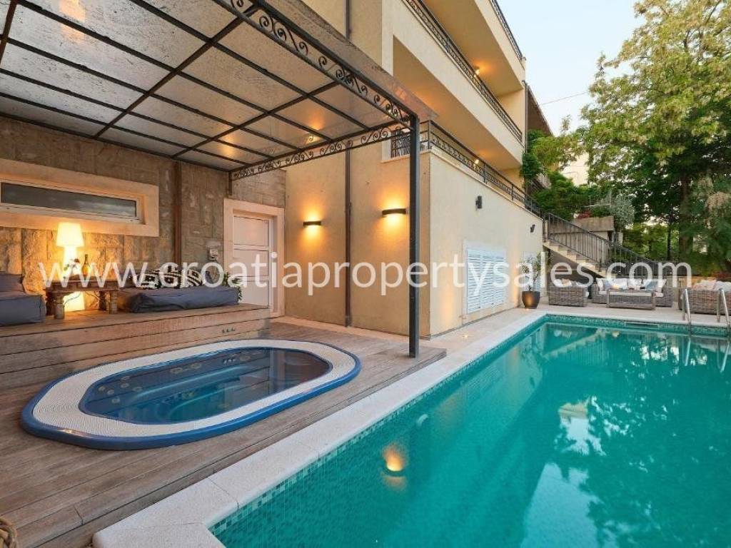 Beautiful villa in an exceptionally beautiful location near the center and the old town.On 480 m2 of living space, the rooms are ideally arranged on 4 floors. In the basement there is a billiard room, entertainment area, wine cellar, small kitchen and bathroom.On the ground floor there is a spacious living room, toilet, kitchen and a lounge.There is an exit to the courtyard with a swimming pool, sunbathing area, jacuzzi and additional outdoor space for relaxation. There is also a summer dining room in the courtyard.On the first floor there are three bedrooms, each with its own bathroom and terrace and all are south-oriented, with lots of daylight. On the second floor there is a Master bedroom with a bathroom with sauna, a large wardrobe, a work area and a large terrace with a sea view.The entire villa is south-oriented and surrounded by greenery, which gives it special privacy in a very special part of the city.Access by car is possible and the villa also has a garage space.