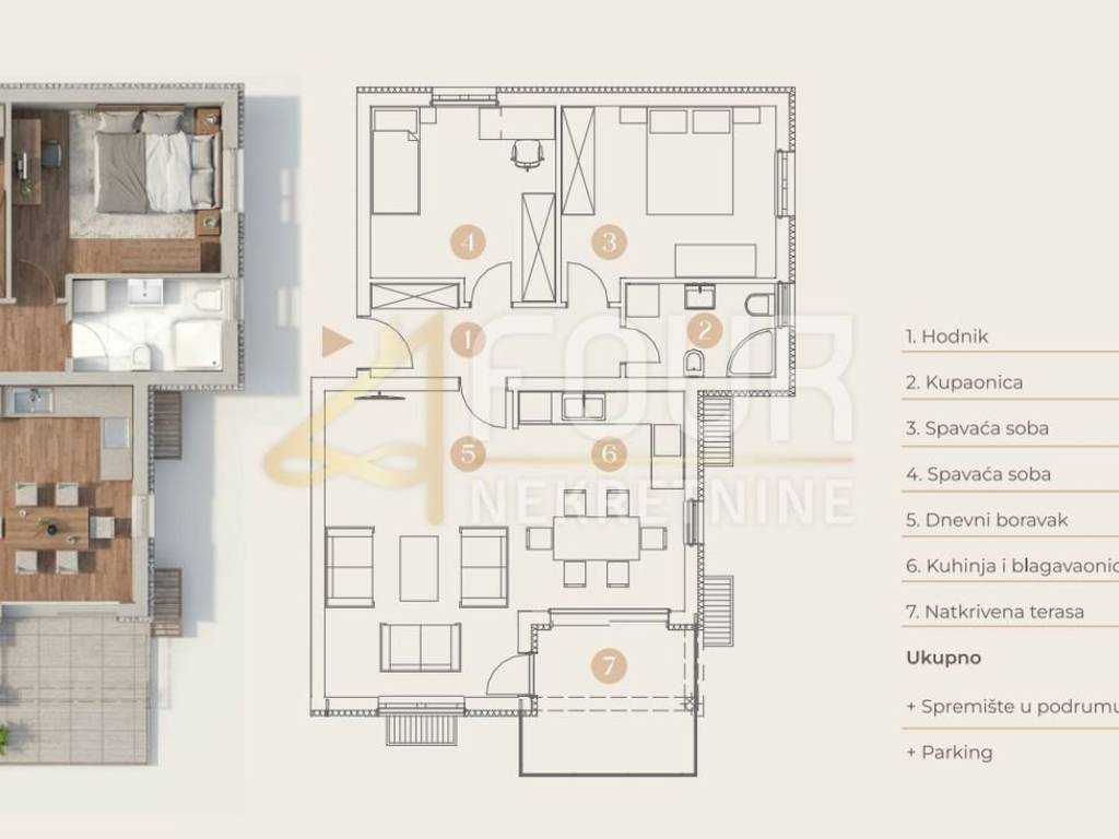An apartment in a quality new building is available in Saršoni! Completion is planned for spring 2027. The apartment has a total area of 77.75m2, with a functional layout consisting of two bedrooms, a living room with kitchen and dining area, hallway, and bathroom. The apartment also features a valuable terrace with an area of 8.78m2. It will be equipped with a modern heating system using a heat pump with underfloor heating, and PVC windows are planned. The apartment also comes with a woodshed and an outdoor parking space.