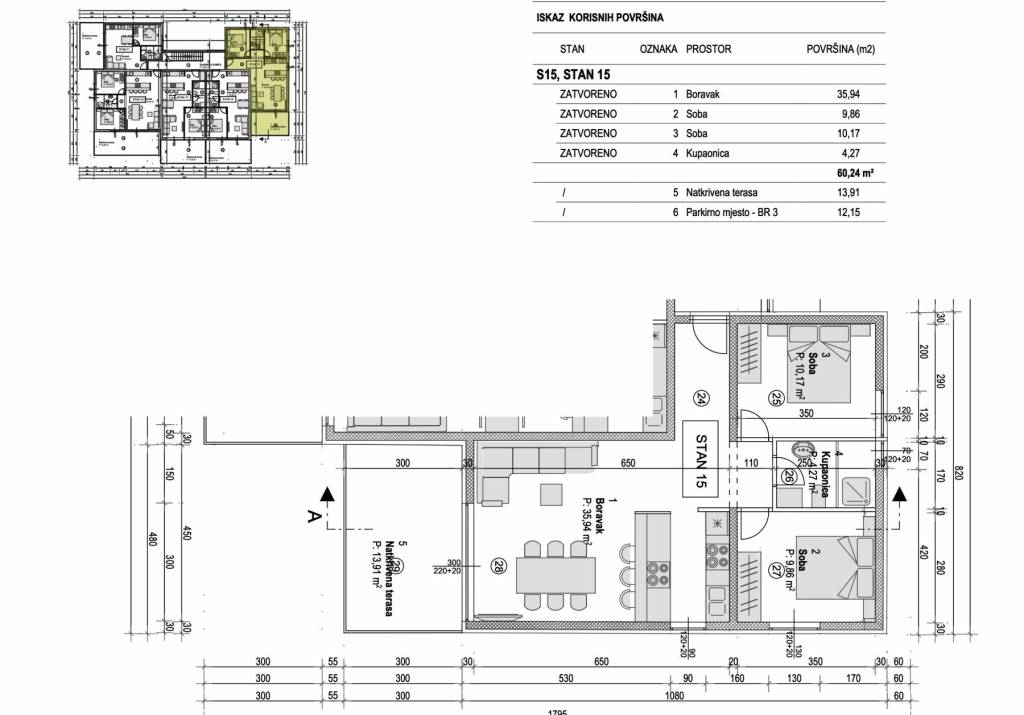 Apartment S15 - 2nd floor - living area 60.24 m2 (2 bedrooms + bathroom) + covered terrace (13.91 m2 - SE) + outdoor parking space PM03, total net area 69.63 m2 = 220,000 EUR